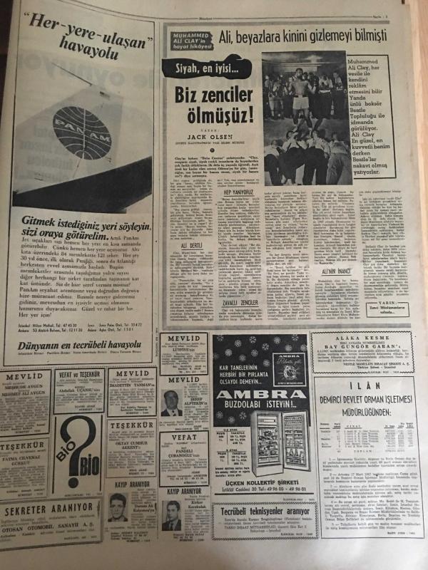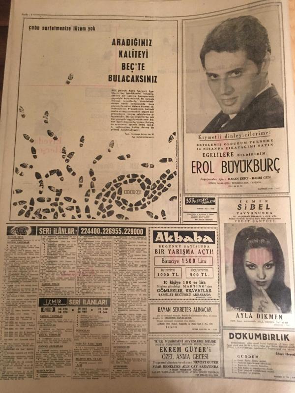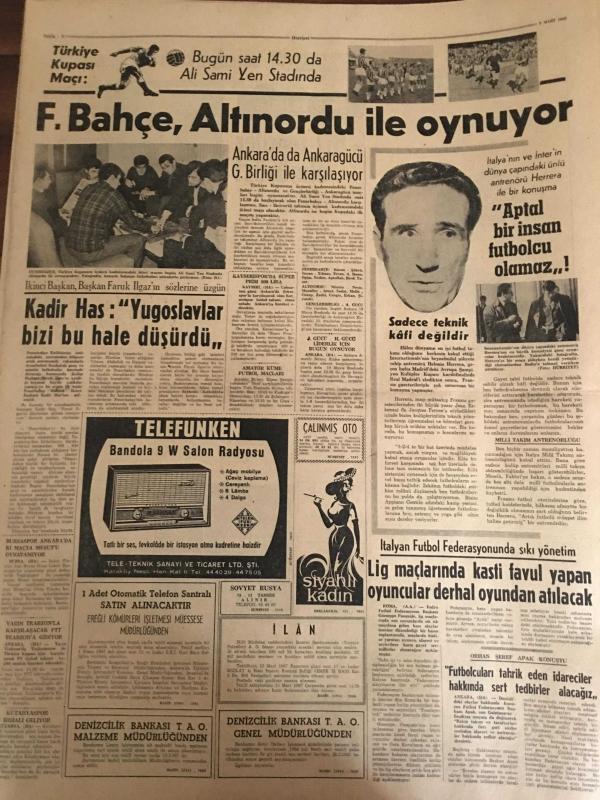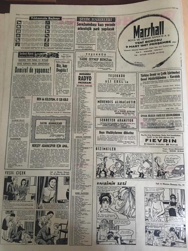 HÜRRİYET GAZETESİ 8 MART 1967 YIL :19 SAYI :6774---Rabianın şerrinden kurtulan mahalleli bayram yapıyor ---3 Genç kadın 10 gün esir kaldı ---Bir komiser kendisini bıçakla ağır yaralayan firari hırsızı öldürdü ---Amerikalılar Karaborsadan Kahve Aldılar ---Üvey oğlunu boğup sonra tavana asan kadın tevkif edildi ---Altın mikrofon kervanı İzmir de ---Köylü kızı Hamiyet nikaha çıtı -pıtı bir hanım olarak geldi --Saraçhanebaşı kazı yerinde arkeolojik park yapılacak ---İran Şahı kendisine bir naip seçilmesini istedi ---Erol Büyükburç ---İzmir Sibel Pavyonunda : Ayla Dikmen --- Türkiye Kupa Maçı : Bugün saat 14:30 da Ali Sami Yen Stadında ---Fenerbahçe ,Altınordu ile oynuyor ---Kadir Has :Yugoslavlar bizi bu hale düşürdü --Lig maçlarında kasti favul yapan oyuncular derhal oyundan atılacak ---Elizabet Taylor u kocasının önünde dudağından öptü ---Ressam şarkıcı ve dansöz ---1967 nin oyuncak bebeği hakiki bir genç kıza benzedi----Toto da 13 bilen 2735 lira alacak --- Yıpranma, sararmalar, kupon kesiği ve yırtılmalar zamana bağlı olarak görülebilir.