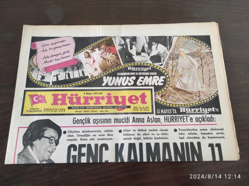 HÜRRİYET GAZETESİ 8 MAYIS 1973 - FOTOROMANLARIN EN BÜYÜĞÜNÜ SUNAR "YUNUS EMRE"- ARAP SALİH SOKAKTA GÖBEK ATTI -, 1 yıl önce satışa sunulmuştur.