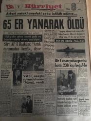 HÜRRİYET GAZETESİ 9 ARALIK 1966 YIL :19 SAYI :6687--65 Er Yanarak Öldü--Siirt AP İl başkanı :Artık canımızdan bezdik ---Vali ,asayiş sorumlularına moral verdi ---Bir Yunan Yolcu Gemisi Battı ,238 Kişi Boğuldu ---Çok eski bir lokomotif hala Adana da çalışıyor ---Emekli bir assubay ,cami önünde bulduğu 12 bin liranın sahibini arıyor ---Çocukların yetiştirme yurtları çoğalacak ---Gegiç : Hiç bir ilerleme yok hala aldığım Fenerbahçe ---Amatör Milli Takımımız Avrupa Kupasında Yarı Finale Kaldı ---Genç takım Rumenlerle berabere kaldı : 1-1---Sigaranın kansere sebep olduğu muhakkak ---7 Hayvan Terbiyecisi Avrupa ya Gidiyor ---Suriye ,Irak Petrol Şirketi ne el koydu ---İzmir de bir çok semti su bastı ---Büyük deniz faciaları ---Eşkiya işi için genel görüşme açılacak --Radyo Programları --Belçika dan yapılan bir davet üzerine ---Polis oyuncak tabancalı bir sabıkalıyı arıyor --- Yıpranma, sararmalar, kupon kesiği ve yırtılmalar zamana bağlı olarak görülebilir.