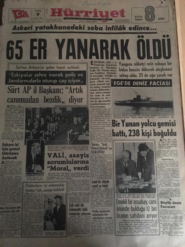 HÜRRİYET GAZETESİ 9 ARALIK 1966 YIL :19 SAYI :6687--65 Er Yanarak Öldü--Siirt AP İl başkanı :Artık canımızdan bezdik ---Vali ,asayiş sorumlularına moral verdi ---Bir Yunan Yolcu Gemisi Battı ,238 Kişi Boğuldu ---Çok eski bir lokomotif hala Adana da çalışıyor ---Emekli bir assubay ,cami önünde bulduğu 12 bin liranın sahibini arıyor ---Çocukların yetiştirme yurtları çoğalacak ---Gegiç : Hiç bir ilerleme yok hala aldığım Fenerbahçe ---Amatör Milli Takımımız Avrupa Kupasında Yarı Finale Kaldı ---Genç takım Rumenlerle berabere kaldı : 1-1---Sigaranın kansere sebep olduğu muhakkak ---7 Hayvan Terbiyecisi Avrupa ya Gidiyor ---Suriye ,Irak Petrol Şirketi ne el koydu ---İzmir de bir çok semti su bastı ---Büyük deniz faciaları ---Eşkiya işi için genel görüşme açılacak --Radyo Programları --Belçika dan yapılan bir davet üzerine ---Polis oyuncak tabancalı bir sabıkalıyı arıyor ---, SEDAT SİMAVİ tarafından kaleme alınmıştır. Kitap 1966 yılında [HÜRRİYET MATBAA] yayınlanmıştır. 8 sayfadır. HÜRRİYET GAZETESİ 9 ARALIK 1966 YIL :19 SAYI :6687--65 Er Yanarak Öldü--Siirt AP İl başkanı :Artık canımızdan bezdik ---Vali ,asayiş sorumlularına moral verdi ---Bir Yunan Yolcu Gemisi Battı ,238 Kişi Boğuldu ---Çok eski bir lokomotif hala Adana da çalışıyor ---Emekli bir assubay ,cami önünde bulduğu 12 bin liranın sahibini arıyor ---Çocukların yetiştirme yurtları çoğalacak ---Gegiç : Hiç bir ilerleme yok hala aldığım Fenerbahçe ---Amatör Milli Takımımız Avrupa Kupasında Yarı Finale Kaldı ---Genç takım Rumenlerle berabere kaldı : 1-1---Sigaranın kansere sebep olduğu muhakkak ---7 Hayvan Terbiyecisi Avrupa ya Gidiyor ---Suriye ,Irak Petrol Şirketi ne el koydu ---İzmir de bir çok semti su bastı ---Büyük deniz faciaları ---Eşkiya işi için genel görüşme açılacak --Radyo Programları --Belçika dan yapılan bir davet üzerine ---Polis oyuncak tabancalı bir sabıkalıyı arıyor --- adlı eser Türkçe dilindedir.