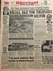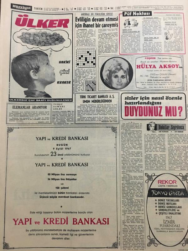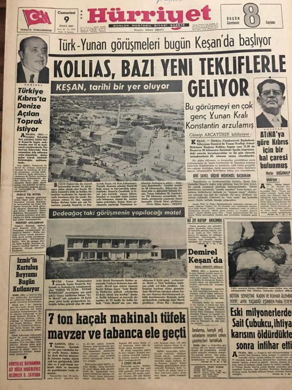 HÜRRİYET GAZETESİ 9 EYLÜL 1967 YIL :20 SAYI :6956--Kollias ,Bazı Yeni Tekliflerle Geliyor --Türkiye Kıbrıs ta Denize Açılan Toprak İstiyor ---İzmir in Kurtuluş Bayramı Bugün Kutlanıyor ---7 Ton Kaçak Makinalı Tüfek Mavzer ve Tabanca Ele Geçti ---Eski milyonerlerden Sait Çubukçu ,ihtiyar karısını öldürdükten sonra intihar etti ---Evliliğin devam etmesi için ihanet bir çareymiş ---Büyük ses sanatkarı : Hülya Aksoy ---Türk Sanat Musikisinin Asıl Değeri :Nesrin Sipahi ---Beşiktaş ,Vefa ile oynuyor ---Eken :2 puan alırsak iyi netice sağlamış olacağız ---Futbolda :İspanya basketbolda :İtalya ile karşılaşıyoruz ---45 .Kurtuluş Yıldönümü ---İlk Bayrak Sarıkışla 'ya çekildi ---Atina 'ya göre Kıbrıs için bir hal çaresi bulunmuş ---- Yıpranma, sararmalar, kupon kesiği ve yırtılmalar zamana bağlı olarak görülebilir.