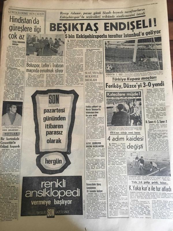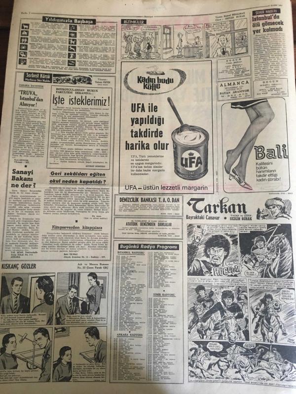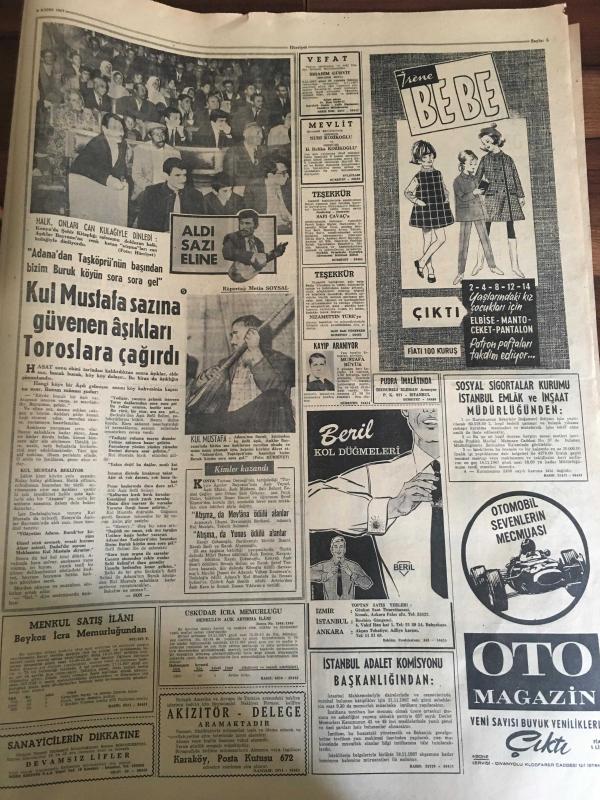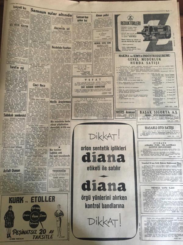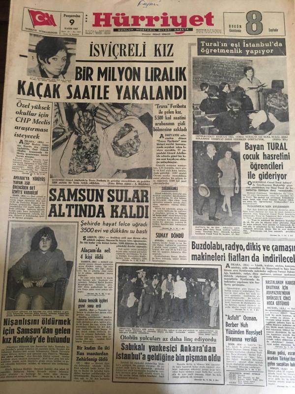 HÜRRİYET GAZETESİ 9 KASIM 1967 YIL :20 SAYI :7017--Bir milyon liralık kaçak saatle yakalandı --Özel yüksel okullar için CHP meclis araştırması isteyecek --Samsun sular altında kaldı ---Nişanlısını öldürmek için Samsun dan gelen kız Kadıköy de bulundu --Bayan Tural çocuk hasretini öğrencileri ile gideriyor --Buzdolabı ,radyo ,dikiş ve çamaşır makineleri fiyatları da indirilecek ---Sabıkalı yankesici Ankara dan İstanbul a geldiğine bin pişman oldu --Asfalt Osman Berber Nuh Yüzünden Haysiyet Divanına Verildi ---Dört yaşındaki oğlunu bavul içinde Bulgaristan dan İtalya ya kaçırdı ---Kul Mustafa sazına güvenen aşıkları Toroslara çağırdı ---Hindistan da güreşlere ilgi çok az --Beşiktaş endişeli ---Boluspor ,Lefter i Trabzon maçında oynatmak istiyor ---Feriköy ,Düzce yi 3-0 yendi ---4 Adım kaidesi değişti --Çocuklar için yapılan oyuncaklar büyüklerin işine de yarayacak --Borazan Efe ye 45 yıl sonra maaş bağlandı --Alaçam da sel 4 kişi öldü --- Yıpranma, sararmalar, kupon kesiği ve yırtılmalar zamana bağlı olarak görülebilir.