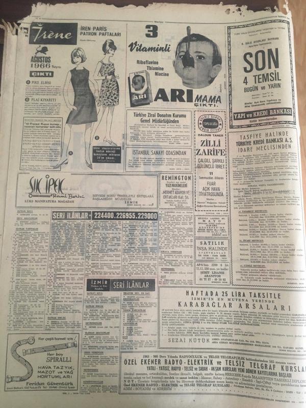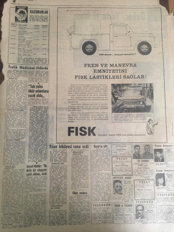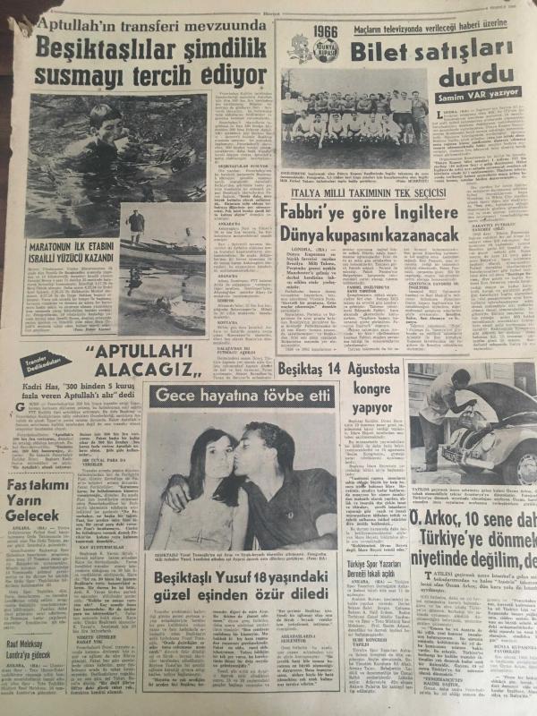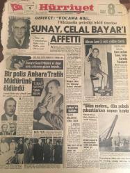 HÜRRİYET GAZETESİ 9 TEMMUZ 1966 YIL :19 SAYI :6534--Sunay ,Celal Bayar 'ı Affetti ---Bir Polis Ankara Trafik Müdürünü Öldürdü : Öldürülen Ankara Trafik Müdürü : Adnan Solmaz ---Ölüm motoru dün sabah çıkartılırken sapan koptu ---Yabancı gemilere bir senede 920 milyon navlun ödüyoruz---Günde 3 Liraya Arçelik ---Kalp hastası kadın en iyi tedaviyi her gün balık tutmakta buldu ---Beşiktaşlılar şimdilik susmayı tercih ediyor --Bilet satışları durdu --Fabbri ye göre İngiltere Dünya Kupasını Kazanacak ---Beşiktaş 14 Ağustos ta Kongre Yapıyor ---Rekor : Yılda 17 Filim --izzet Günay : Bu sene daha az ,fakat öz film çevireceğim dedi ---İzzet Günay ,Fatma Girik le Şeker Hafiye de ---Kadınlar Dövüşüyor ---T.German ,Paris te Plak Doldurmak İçin Anlaştı --İzzet Günay ,Hülya Koçyiğit le Otobüs Yolcusun da ---Sinemalar ,Tiyatrolar ,Radyo Programların---Bayar dün hiç kimseyi kabul etmedi ---Sesle Çizgiler Üstadı : Celal Şahin -- Yıpranma, sararmalar, kupon kesiği ve yırtılmalar zamana bağlı olarak görülebilir.