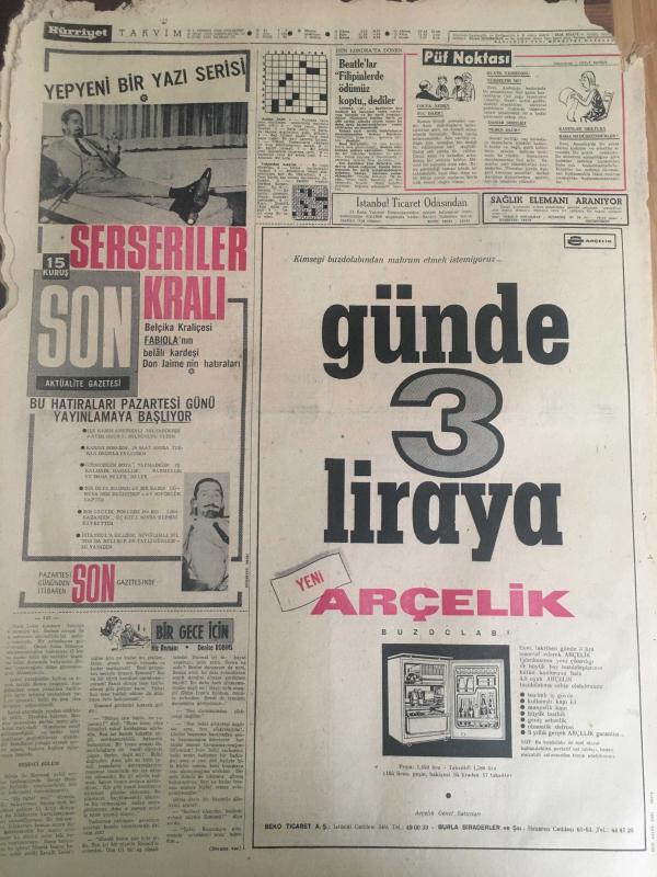 HÜRRİYET GAZETESİ 9 TEMMUZ 1966 YIL :19 SAYI :6534--Sunay ,Celal Bayar 'ı Affetti ---Bir Polis Ankara Trafik Müdürünü Öldürdü : Öldürülen Ankara Trafik Müdürü : Adnan Solmaz ---Ölüm motoru dün sabah çıkartılırken sapan koptu ---Yabancı gemilere bir senede 920 milyon navlun ödüyoruz---Günde 3 Liraya Arçelik ---Kalp hastası kadın en iyi tedaviyi her gün balık tutmakta buldu ---Beşiktaşlılar şimdilik susmayı tercih ediyor --Bilet satışları durdu --Fabbri ye göre İngiltere Dünya Kupasını Kazanacak ---Beşiktaş 14 Ağustos ta Kongre Yapıyor ---Rekor : Yılda 17 Filim --izzet Günay : Bu sene daha az ,fakat öz film çevireceğim dedi ---İzzet Günay ,Fatma Girik le Şeker Hafiye de ---Kadınlar Dövüşüyor ---T.German ,Paris te Plak Doldurmak İçin Anlaştı --İzzet Günay ,Hülya Koçyiğit le Otobüs Yolcusun da ---Sinemalar ,Tiyatrolar ,Radyo Programların---Bayar dün hiç kimseyi kabul etmedi ---Sesle Çizgiler Üstadı : Celal Şahin -- adlı eser, Kitap > Süreli Yayınlar > Gazeteler > Türkiye > Mahalli > Günlük kategorisinde İkinci El olarak satıştadır.