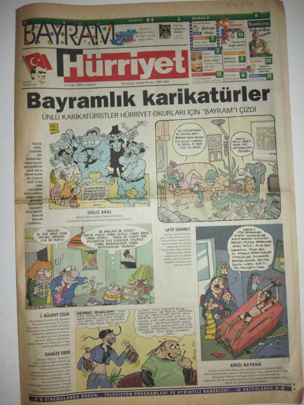 HÜRRİYET GAZETESI DOĞUM GÜNÜ GAZETESI -31 Ocak 1998-Oğuz Aral-Latife Demirci-İ. Bülent Çelik-Ramize Erer-Birol Bayram-Cemal Nadir-Ayşe Arman-Banu Alkan-Ayşegül Aldinç-Catherine Deneuve-Birgül Ulusoy-Banu Bozdemir-Cem Karaca-Candan Erçetin-Engin Arık-Gönül Yazar-Biricik Suden-Bill Gates-Rıdvan Baygut-Ahu Tuğba-Sibel Turnagöl-Gülben Ergen-Cem Yılmaz-Gönül Dönmez-Colin Firth-Gillian Anderson-Anjelica Huston-Lauren Bacall-Billy Crystal-Dustin Hoffman-Jodie Foster-Robin Williams-Matt Damon-Peter Fonda-Robert Duvall-Jack Nicholson-Kate Winslet-Helen Hunt-Kevin Spacey-Kim Basinger-Leonardo DiCaprio-Gary Oldman-Oğuz Haksever-Mete Düren-Füsun Nebil-Tijen Atalay-Ayla Göksel-Pınar Demirkaya-Mutlu Ergün-Tijen Şikar-Başak Şengül-Ceylan Karakoç-Hülya Demirci-Buket Demirkaya-Binnur Aslan-Hülya Uluengin-T. Saylav-Y. Atakan-B. Benmayor-L. Tüzün-A. Karasu-B. Oran-S. Turgut-A. Arman-A. İmer-S. Olcay-A. Hakan-T. Alper-E. Kula-F. Akın-G. Sönmez-E. Sarı-B. Güney-Kazdağı’nın ünlü bitkileri-Bayramlık karikatü adlı eser Türkçe dilindedir. Eserin içeriğinde Türkçe dilinde bölümlere de yer verilmektedir.