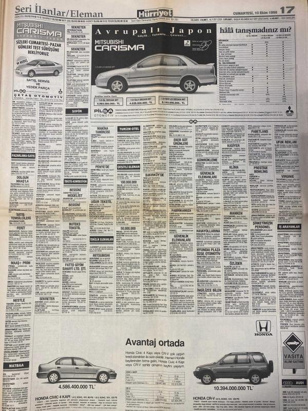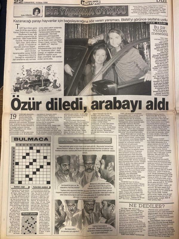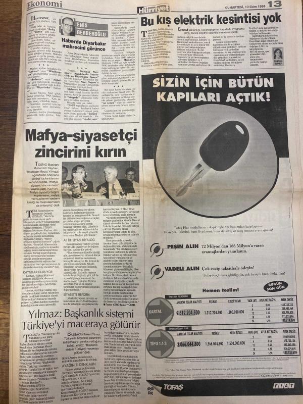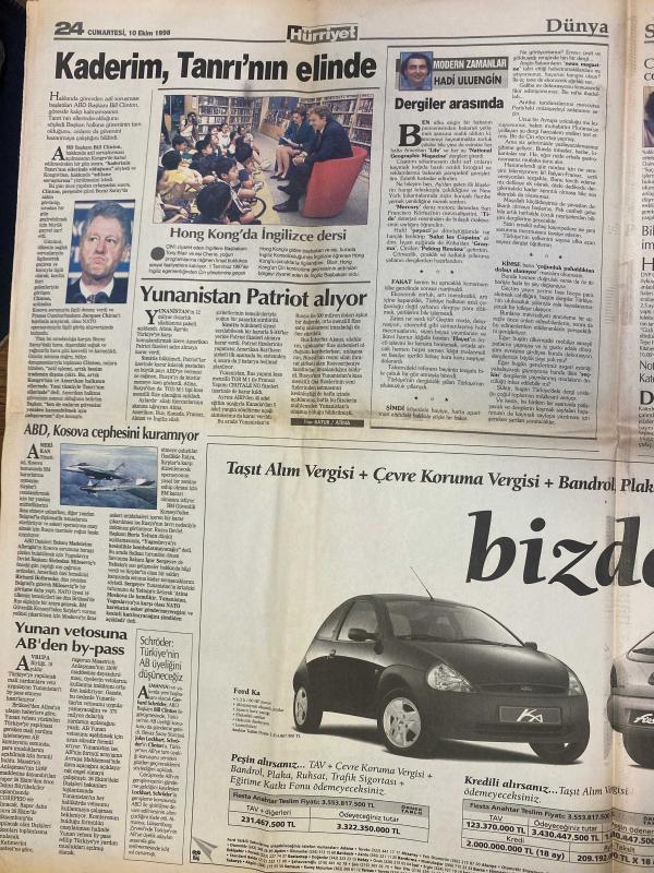HÜRRİYET GAZETESİ DOĞUM GÜNÜ HEDİYESİ - 10 EKİM 1998 -24 SAYFADIR -Kenan Doğulu-Ayten Görgün-Özlem Çakar-Haldun Sevel-Bill Clinton-Hadi Uluengin-Can Yücel-Bülent-Bülent Ecevit-Yalçın Bayer-Enis Berberoğlu-Mukerrem Kayahan-Necati Doğru-Mehmet Mercan Bir yarışma öyküsü-Özür diledi arabayı aldı-Bu bir vicdan meselesi-Ne dediler-Kaderim Tanrı’nın elinde-Hong Kong’da İngilizce dersi-Yunanistan Patriot alıyor-ABD Kosova cephesini kuramıyor-Yunan vetosuna AB’den by-pass-Eskişehir’de festival zamanı-Andy Warhol sergisi geliyor-Can Yücel’in cezası bozuldu-Bildirici kitaplarını imzalıyor-Şam Apo’yu gönderebilir-Panikleten patlamalar-Türkiye MED TV ekranını kararttı-Bu kış elektrik kesintisi yok-Mafya siyasetçi zincirini kırın-Yılmaz: Başkanlık sistemi Türkiye’yi maceraya götürür Karikatür-çizer isimleri: Ustura Kemal-Bin Yaşasın Gazi Paşa-Haldun Sevel-Bülent çiziyor, AYDIN DOĞAN tarafından kaleme alınmıştır. HÜRRİYET GAZETESİ DOĞUM GÜNÜ HEDİYESİ - 10 EKİM 1998 -24 SAYFADIR -Kenan Doğulu-Ayten Görgün-Özlem Çakar-Haldun Sevel-Bill Clinton-Hadi Uluengin-Can Yücel-Bülent-Bülent Ecevit-Yalçın Bayer-Enis Berberoğlu-Mukerrem Kayahan-Necati Doğru-Mehmet Mercan Bir yarışma öyküsü-Özür diledi arabayı aldı-Bu bir vicdan meselesi-Ne dediler-Kaderim Tanrı’nın elinde-Hong Kong’da İngilizce dersi-Yunanistan Patriot alıyor-ABD Kosova cephesini kuramıyor-Yunan vetosuna AB’den by-pass-Eskişehir’de festival zamanı-Andy Warhol sergisi geliyor-Can Yücel’in cezası bozuldu-Bildirici kitaplarını imzalıyor-Şam Apo’yu gönderebilir-Panikleten patlamalar-Türkiye MED TV ekranını kararttı-Bu kış elektrik kesintisi yok-Mafya siyasetçi zincirini kırın-Yılmaz: Başkanlık sistemi Türkiye’yi maceraya götürür Karikatür-çizer isimleri: Ustura Kemal-Bin Yaşasın Gazi Paşa-Haldun Sevel-Bülent çiziyor adlı eser Türkçe dilindedir.