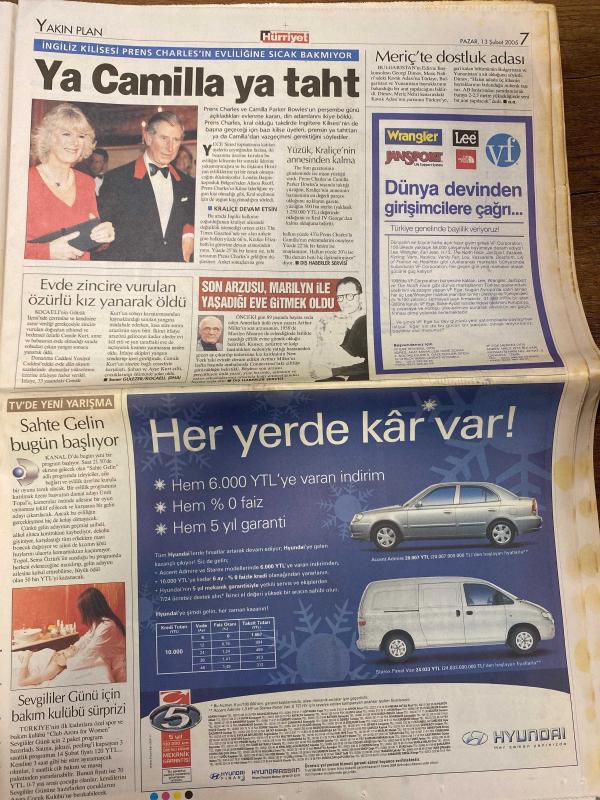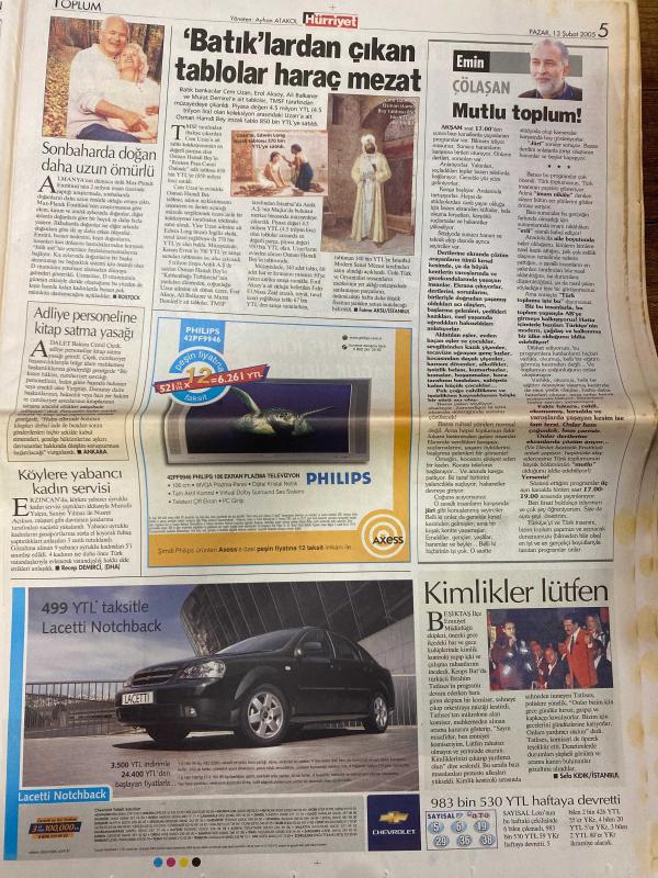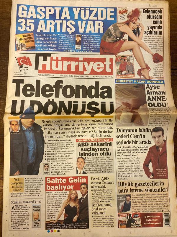 HÜRRİYET GAZETESİ DOĞUM GÜNÜ HEDİYESİ - 13 ŞUBAT 2005 -TAM TAKIM 40 SAYFADIR -İbrahim Selçuk-Ayşe Arman-Fazıl Say-Cem Adrian-Charles Aznavour-Frank Sinatra-Ray Charles-Oktay Ekşi-Ecevit-Öcalan-Murat Bardakçı-Hakan Şükür-İlhan-Soyler-Ribery-Mondragon-Kürşat-Karan-Tuncay-Kutlu-Vedat Okyar-Tümer Metin-Ronaldo-A Yıldırım-Mustafa Küçük-Tayyip Erdoğan-Güler Sabancı-Jose Luis Duran-Muharrem Aydın-Oran Ermiş Gasp yüzde 35 artış var-Evlenecek olursam canlı yayında açıklarım-Telefonda U dönüşü-ABD askerini suçlayınca işinden oldu-Sahte Gelin başlıyor-Ayşe Arman anne oldu-Dünyanın bütün sesleri Cem’in sesinde bir arada-Büyük gazetecilerin para isteme yöntemleri-Zirve yürüyüşü-Başarımızın sırrı fedakarlık-Kırık kanat-9 canlı Kartal-Hırsımın kurbanı oldum-Hep böyle olmalıyız-Avrupa’nın en büyük alışveriş merkezini İstanbul’a yapacağız-Sabancı: Koçsarak ve coşarak yatırımlara devam edeceğiz-Erdoğan: Tünelin ucundaki ışığı gördük her şey bitmedi-Erdoğan’a Fener forması-Maltepe’ye 90 milyon dolarlık C, AYDIN DOĞAN tarafından kaleme alınmıştır. HÜRRİYET GAZETESİ DOĞUM GÜNÜ HEDİYESİ - 13 ŞUBAT 2005 -TAM TAKIM 40 SAYFADIR -İbrahim Selçuk-Ayşe Arman-Fazıl Say-Cem Adrian-Charles Aznavour-Frank Sinatra-Ray Charles-Oktay Ekşi-Ecevit-Öcalan-Murat Bardakçı-Hakan Şükür-İlhan-Soyler-Ribery-Mondragon-Kürşat-Karan-Tuncay-Kutlu-Vedat Okyar-Tümer Metin-Ronaldo-A Yıldırım-Mustafa Küçük-Tayyip Erdoğan-Güler Sabancı-Jose Luis Duran-Muharrem Aydın-Oran Ermiş Gasp yüzde 35 artış var-Evlenecek olursam canlı yayında açıklarım-Telefonda U dönüşü-ABD askerini suçlayınca işinden oldu-Sahte Gelin başlıyor-Ayşe Arman anne oldu-Dünyanın bütün sesleri Cem’in sesinde bir arada-Büyük gazetecilerin para isteme yöntemleri-Zirve yürüyüşü-Başarımızın sırrı fedakarlık-Kırık kanat-9 canlı Kartal-Hırsımın kurbanı oldum-Hep böyle olmalıyız-Avrupa’nın en büyük alışveriş merkezini İstanbul’a yapacağız-Sabancı: Koçsarak ve coşarak yatırımlara devam edeceğiz-Erdoğan: Tünelin ucundaki ışığı gördük her şey bitmedi-Erdoğan’a Fener forması-Maltepe’ye 90 milyon dolarlık C adlı eser Türkçe dilindedir.