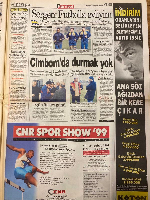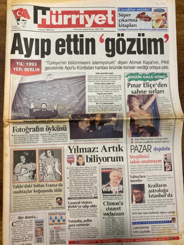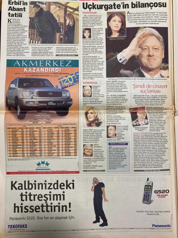 HÜRRİYET GAZETESİ DOĞUM GÜNÜ HEDİYESİ - 14 ŞUBAT 1999 -TAM TAKIM 48 SAYFADIR -Ahmet Kaya-Pınar Eliçe-Murat Bardakçı-Oktay Ekşi-Mesut Yılmaz-Bill Clinton-Banu Alkan-Sadi Somuncuoğlu-Murat-Serkan-Kadir Sabuncuoğlu-Mehmet Çetinkaya-John Toshack-Sami Sarıaloğlu-Korkut Göze-Vedat Okyar-Sadi Kemal Yaşar-Okan-Hagi-Bayram Aydın-Mehmet Ali Erbil-Doğan Uğurlu-Bill Clinton-Monica Lewinsky-Paula Jones-Andy Briller-Kenneth Starr-Nicholson Baker-George Lundberg-Linda Tripp-Newt Gingrich-Bob Livingston Ayıp ettin gözüm-Fotoğrafın öyküsü-Tablodaki Sultan Fransa’da muhtaçlar koğuşunda öldü-Yılmaz Artık biliyorum-General Motors BMW’ye talip oldu-Bir densi…-Clinton’a cinayet suçlaması-Boğa’nın hızı kesildi-Erzurum hayat buldu-Körfez’de büyük hasar-Kartal fena çakıldı-Sinirler gerildi-Tribünde tatsızlık-Sergen Futbolla evliyim-Cimbom’da durmak yok-Oğun’un acı günü-CNR Spor Show ’99-Erbil’in Abant tatili-Uçkurgate’in bilançosu-Şimdi de cinayet suçlaması-YÖK türbana ceza yağdırdı, AYDIN DOĞAN tarafından kaleme alınmıştır. HÜRRİYET GAZETESİ DOĞUM GÜNÜ HEDİYESİ - 14 ŞUBAT 1999 -TAM TAKIM 48 SAYFADIR -Ahmet Kaya-Pınar Eliçe-Murat Bardakçı-Oktay Ekşi-Mesut Yılmaz-Bill Clinton-Banu Alkan-Sadi Somuncuoğlu-Murat-Serkan-Kadir Sabuncuoğlu-Mehmet Çetinkaya-John Toshack-Sami Sarıaloğlu-Korkut Göze-Vedat Okyar-Sadi Kemal Yaşar-Okan-Hagi-Bayram Aydın-Mehmet Ali Erbil-Doğan Uğurlu-Bill Clinton-Monica Lewinsky-Paula Jones-Andy Briller-Kenneth Starr-Nicholson Baker-George Lundberg-Linda Tripp-Newt Gingrich-Bob Livingston Ayıp ettin gözüm-Fotoğrafın öyküsü-Tablodaki Sultan Fransa’da muhtaçlar koğuşunda öldü-Yılmaz Artık biliyorum-General Motors BMW’ye talip oldu-Bir densi…-Clinton’a cinayet suçlaması-Boğa’nın hızı kesildi-Erzurum hayat buldu-Körfez’de büyük hasar-Kartal fena çakıldı-Sinirler gerildi-Tribünde tatsızlık-Sergen Futbolla evliyim-Cimbom’da durmak yok-Oğun’un acı günü-CNR Spor Show ’99-Erbil’in Abant tatili-Uçkurgate’in bilançosu-Şimdi de cinayet suçlaması-YÖK türbana ceza yağdırdı adlı eser Türkçe dilindedir.
