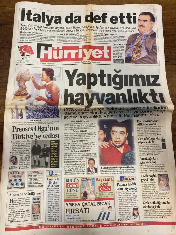 HÜRRİYET GAZETESİ DOĞUM GÜNÜ HEDİYESİ - 17 OCAK 1999 - TAM TAKIM 32 SAYFADIR -Abdullah Öcalan-Haluk Kırcı-Sedat Bucak-Uğur Dündar-Prenses Olga-Murat Bardakçı-Akşener-Oktay Ekşi-Toshack-Cem Yılmaz-Boliç-Fatih Terim-Filip-Emre-Burak-Bayram Aydın-Yalım Erez-Sedat Ergin-Zülfü Livaneli-Nurettin Sözen-Mehmet Moğultay-Ercan Karakaş-Algan Hacaloğlu-Altan Oymen-Cevdet Selvi-Ali Topuz-Hasan Fehmi Güneş-Mehmet Sevigen-Bülent Tanla-Ethem Cankurtaran İtalya da def etti-Yaptığımız hayvanlıktı-Prenses Olga’nın Türkiye’ye vedası-Tita artık yok-Uzun tatilde ilk gün 26 kurban-Kombassan’dan ABD’de zincir-Cep telefonunda süper evlilik-Bacak ağrıları için yeni ilaç-Celile ‘açlık grevinde’-Kırık notlu öğrenciler okulu talan etti-Fenerbahçe’nin Derwall’i olacağım-Toshack’tan birlik çağrısı-Fener’i Boliç güldürdü-Terim içini döktü-Filip: Hedefim Real Madrid-Antalya Hakan için devrede-1 Şubat’ta lider-CHP’de sıra yarışı-Tantan niye piyano çalmıyor?-Parasız yaşamak pahalı-Kaynanatör-Akıl adası adlı eser, Kitap > Süreli Yayınlar > Gazeteler > Türkiye > Genel > Günlük kategorisinde İkinci El olarak satıştadır.