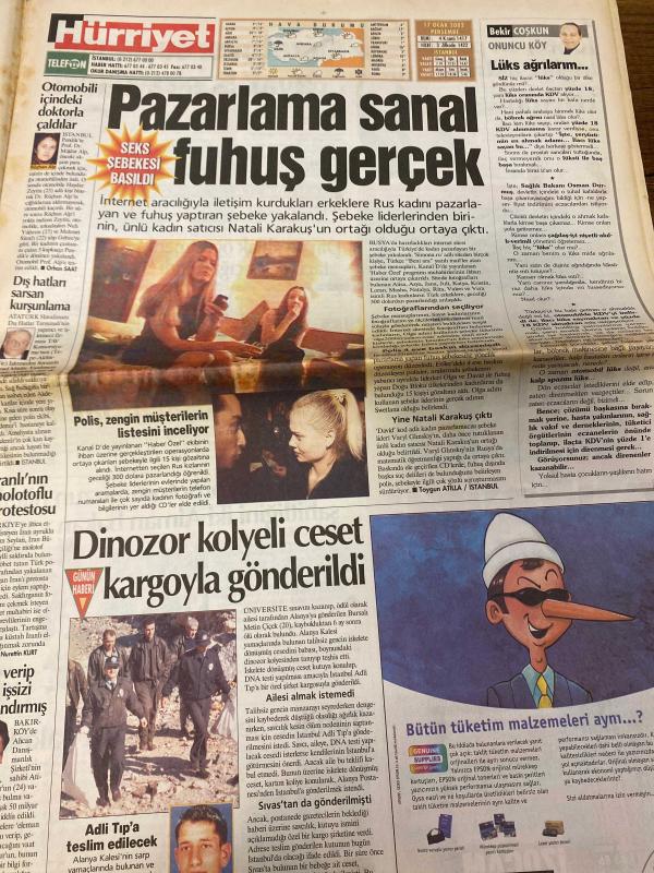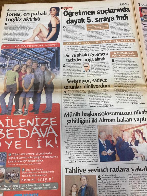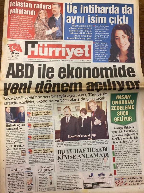 HÜRRİYET GAZETESİ DOĞUM GÜNÜ HEDİYESİ - 17 OCAK 2002 -TAM TAKIM 32 SAYFADIR -Sibel Can-Lara Falay-Bush-Bülent Ecevit-Rahşan Ecevit-Laura Bush-Oktay Ekşi-Ertuğrul Özkök-Muharrem Sarıkaya-Lorant-Fatih Akyel-Ogün Temizkanoğlu-Hami Mandıralı-Lucescu-Berkant-Batista-Halil Özkan-Altan Tanrıkulu-İlhan Soyler-Nihat Kahveci-Levent Kırca-Oya Başar-Pelin Batu-Mustafa Altıoklar-Aşkın Nur Yengi-Haluk Bilginer-Cem Kurtoğlu-Deniz Akkaya-Pakize Suda Telaştan radara yakalandı-Üç intiharda da aynı isim çıktı-ABD ile ekonomide yeni dönem açılıyor-Bu tuhaf hesabı kimse anlamadı-İnsan onurunu zedeleme suçu geliyor-Sözümün eriyim-İkizlerimi karıştırıyorum-Tahkim Kurulu kapısı kapalı-Ogün: Yenildiğimizde G.Saray’ı dövmüyorum-Hami’nin rüyası-Aslan gibisiniz-Kendime yeni yeni geliyorum-Batista üzgün-Süper Marinho-Nihat gidiyor-AIDS iftirasına trilyonluk dava-Aşkın Nur aşık olunacak kadın-Kozlarını tiyatroda paylaşacaklar-Yerli Beyaz Gölge Dizi/Film/Tiyatro: Yılan Hikayesi-Son-Amelie-Oğul Odası-Yüzüklerin Efe, AYDIN DOĞAN tarafından kaleme alınmıştır. HÜRRİYET GAZETESİ DOĞUM GÜNÜ HEDİYESİ - 17 OCAK 2002 -TAM TAKIM 32 SAYFADIR -Sibel Can-Lara Falay-Bush-Bülent Ecevit-Rahşan Ecevit-Laura Bush-Oktay Ekşi-Ertuğrul Özkök-Muharrem Sarıkaya-Lorant-Fatih Akyel-Ogün Temizkanoğlu-Hami Mandıralı-Lucescu-Berkant-Batista-Halil Özkan-Altan Tanrıkulu-İlhan Soyler-Nihat Kahveci-Levent Kırca-Oya Başar-Pelin Batu-Mustafa Altıoklar-Aşkın Nur Yengi-Haluk Bilginer-Cem Kurtoğlu-Deniz Akkaya-Pakize Suda Telaştan radara yakalandı-Üç intiharda da aynı isim çıktı-ABD ile ekonomide yeni dönem açılıyor-Bu tuhaf hesabı kimse anlamadı-İnsan onurunu zedeleme suçu geliyor-Sözümün eriyim-İkizlerimi karıştırıyorum-Tahkim Kurulu kapısı kapalı-Ogün: Yenildiğimizde G.Saray’ı dövmüyorum-Hami’nin rüyası-Aslan gibisiniz-Kendime yeni yeni geliyorum-Batista üzgün-Süper Marinho-Nihat gidiyor-AIDS iftirasına trilyonluk dava-Aşkın Nur aşık olunacak kadın-Kozlarını tiyatroda paylaşacaklar-Yerli Beyaz Gölge Dizi/Film/Tiyatro: Yılan Hikayesi-Son-Amelie-Oğul Odası-Yüzüklerin Efe adlı eser Türkçe dilindedir.