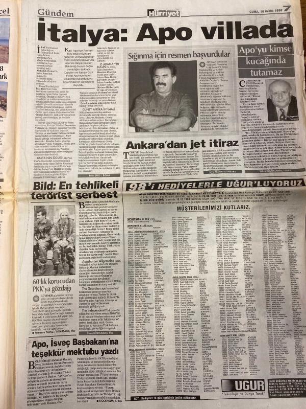 HÜRRİYET GAZETESİ DOĞUM GÜNÜ HEDİYESİ - 18 ARALIK 1997 -TAM TAKIM 46 SAYFADIR -Bill Clinton-Saddam Hüseyin-Abdullah Öcalan-D’Alema-Oktay Ekşi-Ertuğrul Özkök-Ortaç-Rüştü-Löw-Harun-Toshack-Fatih Terim-Yener Süsoy-Serdar Ortaç-Mumcu-Çölaşan-Bekir Coşkun-Vedat Yelkenci-Ağar Devirene kadar-Çabuk o adama bir yer bulun-Telefon dinleme skandalı-Saddam alçaklar karşımıza çıkın-Sürpriz Çöl Tilkisi Bill’i kurtaramadı-Ülker yine tatsız-Fener Çizme’de tutunamadı-Baraj 75 puan-Rüştü idmana çıkmadı-Fatura yıldızlara-Golcülerin zafer keyfi-Cezalar kapıda-Ertuğrul özür dileriz-Hesabını soracağız-Cezaevinde 66 gün-Tüyap’ta facia-44 yaşında kansere yenildi-Yasak aşka ölüm tehdidi Güz Aral’ın karalama defteri-18 gece uyku uyumadım-Abdullah Öcalan-Kamran İnan-Kenan Demir-Ramazan Yavuz İtalya Apo villada-Sığınma için resmen başvurdular-Ankara’dan jet itiraz-Apo’yu kimse kucağında tutamaz-Bild en tehlikeli terörist serbest-60’lık korucudan PKK’ya gözdağı-Apo İsveç Başbakanı’na teşekkür mektubu yazdı, AYDIN DOĞAN tarafından kaleme alınmıştır. HÜRRİYET GAZETESİ DOĞUM GÜNÜ HEDİYESİ - 18 ARALIK 1997 -TAM TAKIM 46 SAYFADIR -Bill Clinton-Saddam Hüseyin-Abdullah Öcalan-D’Alema-Oktay Ekşi-Ertuğrul Özkök-Ortaç-Rüştü-Löw-Harun-Toshack-Fatih Terim-Yener Süsoy-Serdar Ortaç-Mumcu-Çölaşan-Bekir Coşkun-Vedat Yelkenci-Ağar Devirene kadar-Çabuk o adama bir yer bulun-Telefon dinleme skandalı-Saddam alçaklar karşımıza çıkın-Sürpriz Çöl Tilkisi Bill’i kurtaramadı-Ülker yine tatsız-Fener Çizme’de tutunamadı-Baraj 75 puan-Rüştü idmana çıkmadı-Fatura yıldızlara-Golcülerin zafer keyfi-Cezalar kapıda-Ertuğrul özür dileriz-Hesabını soracağız-Cezaevinde 66 gün-Tüyap’ta facia-44 yaşında kansere yenildi-Yasak aşka ölüm tehdidi Güz Aral’ın karalama defteri-18 gece uyku uyumadım-Abdullah Öcalan-Kamran İnan-Kenan Demir-Ramazan Yavuz İtalya Apo villada-Sığınma için resmen başvurdular-Ankara’dan jet itiraz-Apo’yu kimse kucağında tutamaz-Bild en tehlikeli terörist serbest-60’lık korucudan PKK’ya gözdağı-Apo İsveç Başbakanı’na teşekkür mektubu yazdı adlı eser Türkçe dilindedir.