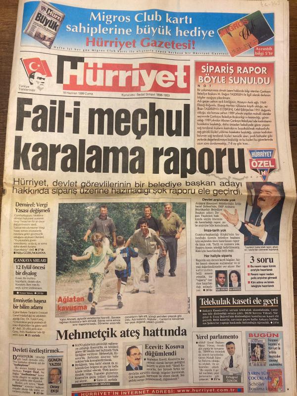 HÜRRİYET GAZETESİ DOĞUM GÜNÜ HEDİYESİ - 18 HAZİRAN 1999 -TAM TAKIM 42 SAYFADIR -Demirel-Oktay Ekşi-Ecevit-Ertuğrul Özkök-Aziz Yıldırım-Rıdvan Dilmen-Celal Doğan-Halil Özan-Sergen-Fatih Terim-Arif-Okan-Tayfur-Süleyman Seba-Selahattin Gökhan-Bülent Ersöz-Ruşen Güven-Bayram Aydın-Erdal İnönü-Tansu Çiller-Yener Süsoy-Evren-Korutürk-Şah-Gülden Aydın-Serdar Turgut-Fausto Papetti Fail-i Meçhul Karalama Raporu-Sipariş Rapor Böyle Sunuldu-Çankaya Sırları-12 Eylül Öncesi Bir Diyalog-Ağlatan Kavuşma-Mehmetçik Ateş Hattında-Ecevit Kosova Düğümlendi-Vergi Yasası Değişmeli-Telekulak Kaseti Ele Geçti-Yerel Parlamento-Johnson Fener’de-Ver Sergen’i Al Dükkanı-F.Bahçe Bursasporlu Murat’ın Peşinde-F.Bahçe Alpay İçin Gün Sayıyor-Cimbom’da Mutlu Son-Çok Para Aldık-Seba Oktay Süper Golcü-Transferlerimiz Devam Edecek-Göztepe’nin Bülent Israrı-Evren Bir Muhtıra Hazırladık Destek Olun Korutürk Beni Meclis Seçti İçime Sindiremem-Şah Enginarı Yemedi-Dinleme Cihazı-Muhtırayı Üç Gün Sonra Öğrendik-Venedik Bienali, AYDIN DOĞAN tarafından kaleme alınmıştır. HÜRRİYET GAZETESİ DOĞUM GÜNÜ HEDİYESİ - 18 HAZİRAN 1999 -TAM TAKIM 42 SAYFADIR -Demirel-Oktay Ekşi-Ecevit-Ertuğrul Özkök-Aziz Yıldırım-Rıdvan Dilmen-Celal Doğan-Halil Özan-Sergen-Fatih Terim-Arif-Okan-Tayfur-Süleyman Seba-Selahattin Gökhan-Bülent Ersöz-Ruşen Güven-Bayram Aydın-Erdal İnönü-Tansu Çiller-Yener Süsoy-Evren-Korutürk-Şah-Gülden Aydın-Serdar Turgut-Fausto Papetti Fail-i Meçhul Karalama Raporu-Sipariş Rapor Böyle Sunuldu-Çankaya Sırları-12 Eylül Öncesi Bir Diyalog-Ağlatan Kavuşma-Mehmetçik Ateş Hattında-Ecevit Kosova Düğümlendi-Vergi Yasası Değişmeli-Telekulak Kaseti Ele Geçti-Yerel Parlamento-Johnson Fener’de-Ver Sergen’i Al Dükkanı-F.Bahçe Bursasporlu Murat’ın Peşinde-F.Bahçe Alpay İçin Gün Sayıyor-Cimbom’da Mutlu Son-Çok Para Aldık-Seba Oktay Süper Golcü-Transferlerimiz Devam Edecek-Göztepe’nin Bülent Israrı-Evren Bir Muhtıra Hazırladık Destek Olun Korutürk Beni Meclis Seçti İçime Sindiremem-Şah Enginarı Yemedi-Dinleme Cihazı-Muhtırayı Üç Gün Sonra Öğrendik-Venedik Bienali adlı eser Türkçe dilindedir.