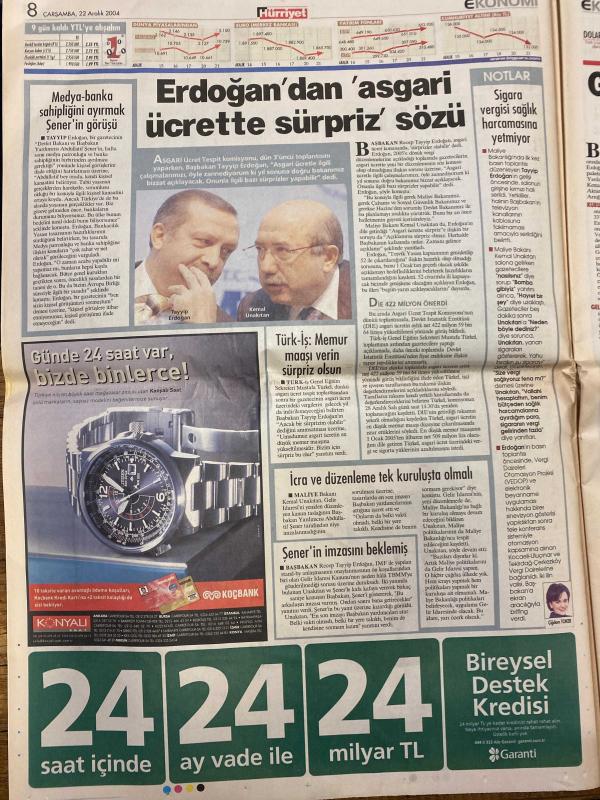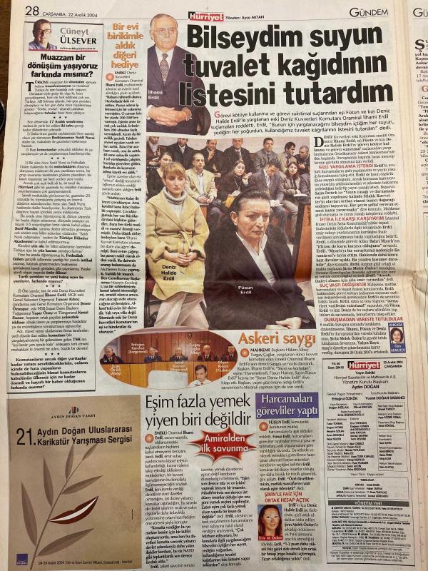 HÜRRİYET GAZETESİ DOĞUM GÜNÜ HEDİYESİ - 22 ARALIK 2004 -TAM TAKIM 52 SAYFADIR -Recep Tayyip Erdoğan-George Bush-Füsun Erdil-Deniz Erdil-İlhami Erdil-Uday Halide Erdil-Deniz Halide Erdil-Erdoğan Kongar-Osman Altıntaş-Cüneyt Ülsever-Ayça Aktan-Özlem Gürses-Ceyda Karan-Bekir Coşkun-Yaşar Anter-Neset Karadağ-Orhan Çakır-Harun Arka-Esat Rençber-Doğan Akbaş-Ertuğrul Özkök-Catherine Blair Katilleri bulun sayın başkan-Karim çok az yemek yerdi-Hayatuma giren erkeklerle orkestra kuruldu-Uday’ın Ferrari’si İstanbul’da çıktı-KDV gıda sağlık ve eğitimde 10 puan indi-Mamak kriterleri-Bayan Blair çarşafı savundu-O para bende olsa görürdünüz-Hakan Şükür 1 numaradır-Ümit Karan masallarla yaşıyor-Uğur Cimbom’a evet dedi-Fener zirvede-Kartal uçuyor-Bilseydim suyun tuvalet kağıdının listesini tutardım-Askeri saygı-Eşim fazla yemek yiyen biri değildir-Harcamaları görevliler yaptı-Kocasiyla bir olup kardeşini pazarladı-Kurtarmak isterken öldüler-Bebeğini boğan anneye ömür boyu hapis istendi-Hırsız Karikat, AYDIN DOĞAN tarafından kaleme alınmıştır. HÜRRİYET GAZETESİ DOĞUM GÜNÜ HEDİYESİ - 22 ARALIK 2004 -TAM TAKIM 52 SAYFADIR -Recep Tayyip Erdoğan-George Bush-Füsun Erdil-Deniz Erdil-İlhami Erdil-Uday Halide Erdil-Deniz Halide Erdil-Erdoğan Kongar-Osman Altıntaş-Cüneyt Ülsever-Ayça Aktan-Özlem Gürses-Ceyda Karan-Bekir Coşkun-Yaşar Anter-Neset Karadağ-Orhan Çakır-Harun Arka-Esat Rençber-Doğan Akbaş-Ertuğrul Özkök-Catherine Blair Katilleri bulun sayın başkan-Karim çok az yemek yerdi-Hayatuma giren erkeklerle orkestra kuruldu-Uday’ın Ferrari’si İstanbul’da çıktı-KDV gıda sağlık ve eğitimde 10 puan indi-Mamak kriterleri-Bayan Blair çarşafı savundu-O para bende olsa görürdünüz-Hakan Şükür 1 numaradır-Ümit Karan masallarla yaşıyor-Uğur Cimbom’a evet dedi-Fener zirvede-Kartal uçuyor-Bilseydim suyun tuvalet kağıdının listesini tutardım-Askeri saygı-Eşim fazla yemek yiyen biri değildir-Harcamaları görevliler yaptı-Kocasiyla bir olup kardeşini pazarladı-Kurtarmak isterken öldüler-Bebeğini boğan anneye ömür boyu hapis istendi-Hırsız Karikat adlı eser Türkçe dilindedir.