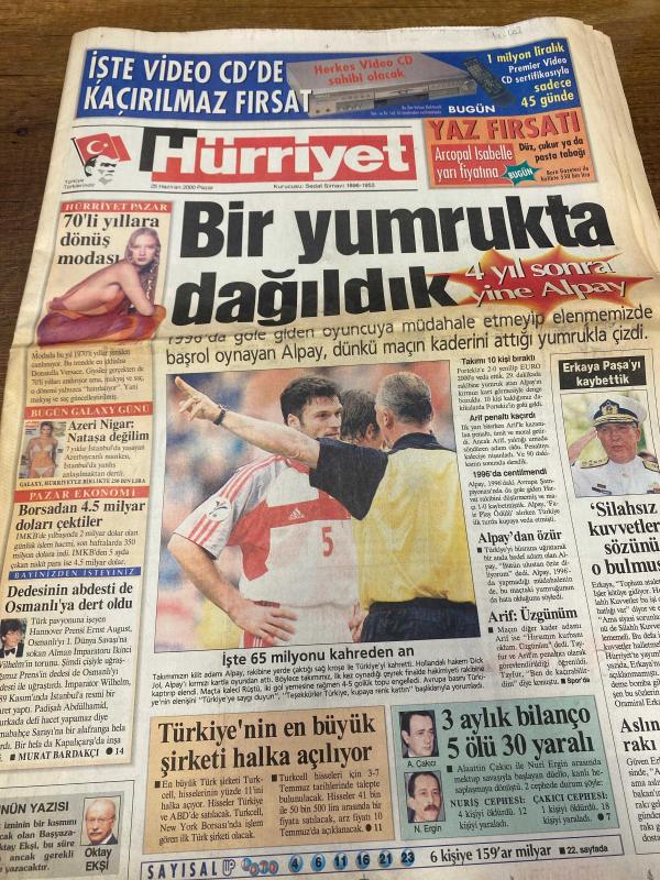 HÜRRİYET GAZETESİ DOĞUM GÜNÜ HEDİYESİ - 25 HAZİRAN 2000 -TAM TAKIM 46 SAYFADIR -Oktay Ekşi-İlber Ortaylı-Murat Bardakçı-N.Ergin-Halil ÖZKAN-İlhan Söyler-Urguay Şeren-Salih Keçeci-Yener ALTUNBAŞ-Nezih Açıkgoz-Vladimir Putin-Süleyman Demirel-Madeleine Albright Bir yumrukta dağıldık-Hırsımın kurbanıyım-Ah Alpay vah Arif-4 yıl önce 4 yıl sonra-Alpay’dan özür-Silahsız Kuvvetler sözü bulundu-Desedinin desteği de Osmanlı Padişahı’na yeter oldu-Türkiye’nin en büyüğü şirketi halka açılıyor-3 aylık bilanço %15.3’ü yaralı-Aslında hiç rakı sevmezdi-Borsadan 6 milyar dolar çektiler-70’li yıllara dönüş modası-Serdar Ortaç jandarma ağlattı-İpeksiç haremimi Bodrum’da açtı-Rusya’da aç mahkumlar balık avına gönderiliyor-Putin Baba’nın yolunda-Emrin olur Albright Euro 2000, AYDIN DOĞAN tarafından kaleme alınmıştır. HÜRRİYET GAZETESİ DOĞUM GÜNÜ HEDİYESİ - 25 HAZİRAN 2000 -TAM TAKIM 46 SAYFADIR -Oktay Ekşi-İlber Ortaylı-Murat Bardakçı-N.Ergin-Halil ÖZKAN-İlhan Söyler-Urguay Şeren-Salih Keçeci-Yener ALTUNBAŞ-Nezih Açıkgoz-Vladimir Putin-Süleyman Demirel-Madeleine Albright Bir yumrukta dağıldık-Hırsımın kurbanıyım-Ah Alpay vah Arif-4 yıl önce 4 yıl sonra-Alpay’dan özür-Silahsız Kuvvetler sözü bulundu-Desedinin desteği de Osmanlı Padişahı’na yeter oldu-Türkiye’nin en büyüğü şirketi halka açılıyor-3 aylık bilanço %15.3’ü yaralı-Aslında hiç rakı sevmezdi-Borsadan 6 milyar dolar çektiler-70’li yıllara dönüş modası-Serdar Ortaç jandarma ağlattı-İpeksiç haremimi Bodrum’da açtı-Rusya’da aç mahkumlar balık avına gönderiliyor-Putin Baba’nın yolunda-Emrin olur Albright Euro 2000 adlı eser Türkçe dilindedir.