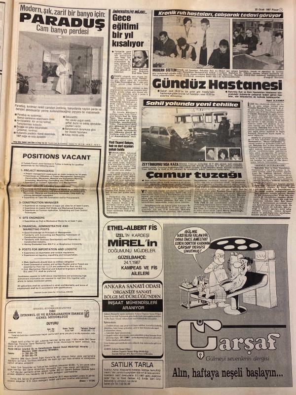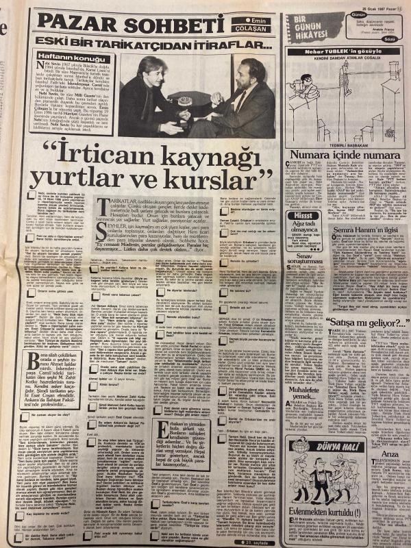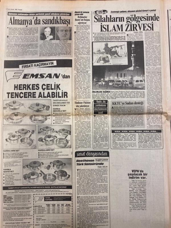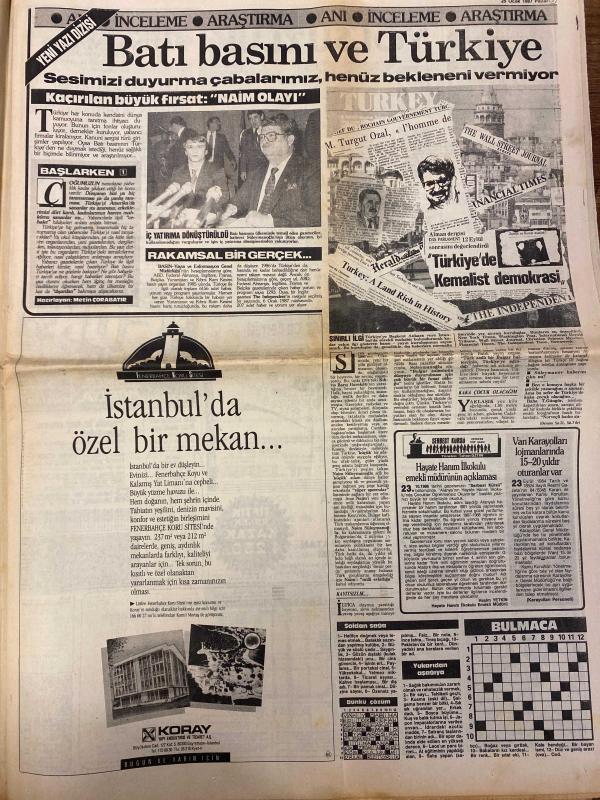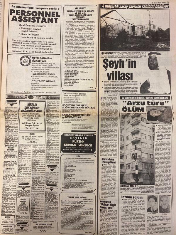 HÜRRİYET GAZETESİ DOĞUM GÜNÜ HEDİYESİ - 25 OCAK 1987 -TAM TAKIM 24 SAYFADIR -Erbakan-Emin Çölaşan-Oktay Ekşi-Ertuğrul Özkök-Remzi Öğretmen-Arzu-Mesut Yılmaz-Turgut Özal-Hasbi Ağa-Milutinovic-Lobanovski-Derwall-Mehmet Güner-Süleyman Demirel-Hasan Mutlucan-Metin Çorabatır-M. Turgut Özal-Faruk Bildirici-Hayate Hanım-Nihat Alkane-Ethel Fis-Albert Fis-Mirel-Fuat Sağer-Kulu Atalay-Yavuz Gökmen-İbrahim Altan-Arzu Çolak-Hasan Çolak İrticanın başı Erbakan-PKK çocukları taradı-Karda yağmur lu tatil-Kocam suçsuz Arzu kocama aşıkmış-Zirve öncesi sabotaj-SHP anayasaya hazırlanıyor-24 Ocak’ın yıldönümü-Kulüp değil milli takım-Kısa vadede çok şey yapılamaz-Bakırköy alkışlandı-Trabzon G. Saray-Süper Lig’e okey çıktı-Batı basını ve Türkiye-Naim olayı-Rakımsal bir gerçek-Türkiye’de Kemalist demokrasi-İstanbul’da özel bir mekan-Gece eğitimi bir yıl kısalıyor-Gündüz hastanesi-Camur tuzağı-Şeyh’in villası-Arzu türü ölüm-İntihar salgını-Bulgar Haçlı savaşı açtı, AYDIN DOĞAN tarafından kaleme alınmıştır. HÜRRİYET GAZETESİ DOĞUM GÜNÜ HEDİYESİ - 25 OCAK 1987 -TAM TAKIM 24 SAYFADIR -Erbakan-Emin Çölaşan-Oktay Ekşi-Ertuğrul Özkök-Remzi Öğretmen-Arzu-Mesut Yılmaz-Turgut Özal-Hasbi Ağa-Milutinovic-Lobanovski-Derwall-Mehmet Güner-Süleyman Demirel-Hasan Mutlucan-Metin Çorabatır-M. Turgut Özal-Faruk Bildirici-Hayate Hanım-Nihat Alkane-Ethel Fis-Albert Fis-Mirel-Fuat Sağer-Kulu Atalay-Yavuz Gökmen-İbrahim Altan-Arzu Çolak-Hasan Çolak İrticanın başı Erbakan-PKK çocukları taradı-Karda yağmur lu tatil-Kocam suçsuz Arzu kocama aşıkmış-Zirve öncesi sabotaj-SHP anayasaya hazırlanıyor-24 Ocak’ın yıldönümü-Kulüp değil milli takım-Kısa vadede çok şey yapılamaz-Bakırköy alkışlandı-Trabzon G. Saray-Süper Lig’e okey çıktı-Batı basını ve Türkiye-Naim olayı-Rakımsal bir gerçek-Türkiye’de Kemalist demokrasi-İstanbul’da özel bir mekan-Gece eğitimi bir yıl kısalıyor-Gündüz hastanesi-Camur tuzağı-Şeyh’in villası-Arzu türü ölüm-İntihar salgını-Bulgar Haçlı savaşı açtı adlı eser Türkçe dilindedir.