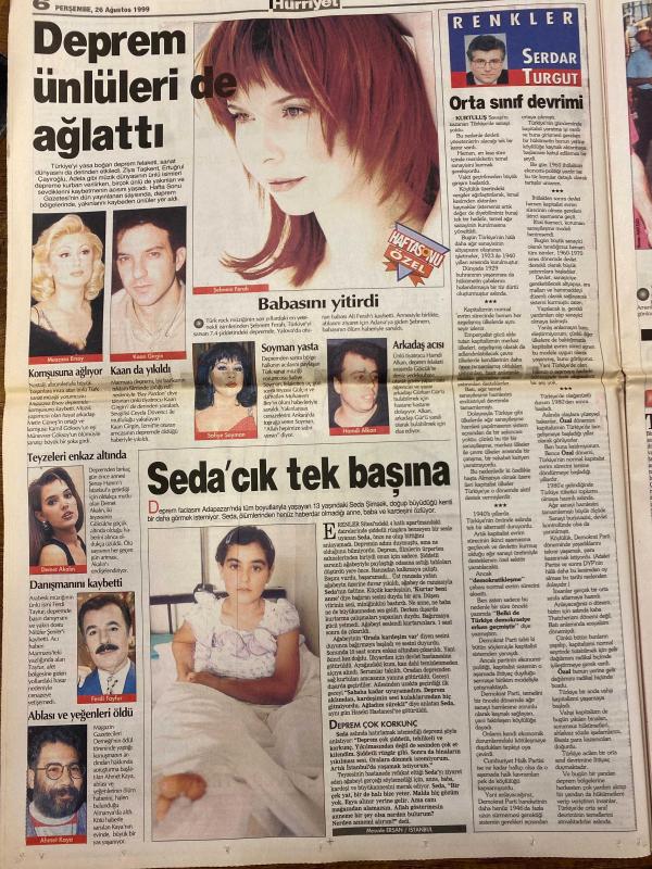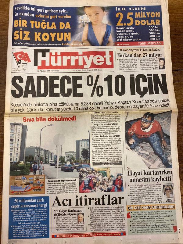 HÜRRİYET GAZETESİ DOĞUM GÜNÜ HEDİYESİ - 26 AĞUSTOS 1999 -TAM TAKIM 38 SAYFADIR -Tarkan-Veli Göçer-Oya Eroğlulu-Ayşe Arman-Holli Özkan-Turgay Şeren-Ziya Şengül-İlhan Söyler-Bekir Coşkun-Sabina Ferah-Müesser Ersoy-Kaan Girgin-Demet Akalın-Ferdi Tayfur-Ahmet Kaya-Hande Ataizi-Hüsnü Gökhan-Serdar Turgut Bir Tuğla da Siz Koyun-Sadece %10 İçin-Sıva Bile Dökülmedi-Acı İtiraflar-Yardım 42 Trilyon-Ecevit Harcamalar Şeffaf Olacak-Hayat Kurtarırken Annesini Kaybetti-Bin Kişi Daha Kurtarılırdı-Teşekkürler Fener’im-Acılar Santrada-Sağolasın Aslanım-Hakan Şükür’e 8 Dikiş-Asrın Yüzsüzü-Hırsız ve Vicdansız-Umutlar Tükendi-Deprem Ünlüleri de Ağlattı-Seda’cık Tek Başına-Orta Sınıf Devrimi-Emin Çölaşan-Dilek Duru-Hakan Tartan-Cüneyt Ülsever-Ertuğrul Özkök-Oktay Ekşi-Selim Türsay-Bulent Ecevit Hepsine Alkışlar-Tarihi Bir Gün-Teşekkür Çiçeği-Dostluğumuzu Hep Hatırlayın-Komşu’yla Barış Rüzgarı-Yardım Çöplüğü-Şimdi de Çevre Alarmı-Bebeğime Sıcak Yemek Lütfen-Kanal 6’ya Sansür Siyasi-Çadırkente Elektrik-Tam, AYDIN DOĞAN tarafından kaleme alınmıştır. HÜRRİYET GAZETESİ DOĞUM GÜNÜ HEDİYESİ - 26 AĞUSTOS 1999 -TAM TAKIM 38 SAYFADIR -Tarkan-Veli Göçer-Oya Eroğlulu-Ayşe Arman-Holli Özkan-Turgay Şeren-Ziya Şengül-İlhan Söyler-Bekir Coşkun-Sabina Ferah-Müesser Ersoy-Kaan Girgin-Demet Akalın-Ferdi Tayfur-Ahmet Kaya-Hande Ataizi-Hüsnü Gökhan-Serdar Turgut Bir Tuğla da Siz Koyun-Sadece %10 İçin-Sıva Bile Dökülmedi-Acı İtiraflar-Yardım 42 Trilyon-Ecevit Harcamalar Şeffaf Olacak-Hayat Kurtarırken Annesini Kaybetti-Bin Kişi Daha Kurtarılırdı-Teşekkürler Fener’im-Acılar Santrada-Sağolasın Aslanım-Hakan Şükür’e 8 Dikiş-Asrın Yüzsüzü-Hırsız ve Vicdansız-Umutlar Tükendi-Deprem Ünlüleri de Ağlattı-Seda’cık Tek Başına-Orta Sınıf Devrimi-Emin Çölaşan-Dilek Duru-Hakan Tartan-Cüneyt Ülsever-Ertuğrul Özkök-Oktay Ekşi-Selim Türsay-Bulent Ecevit Hepsine Alkışlar-Tarihi Bir Gün-Teşekkür Çiçeği-Dostluğumuzu Hep Hatırlayın-Komşu’yla Barış Rüzgarı-Yardım Çöplüğü-Şimdi de Çevre Alarmı-Bebeğime Sıcak Yemek Lütfen-Kanal 6’ya Sansür Siyasi-Çadırkente Elektrik-Tam adlı eser Türkçe dilindedir.