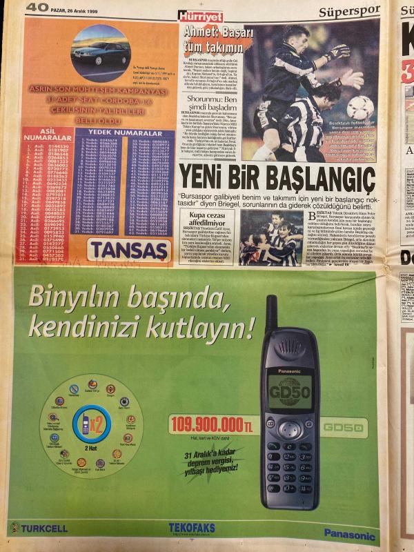 HÜRRİYET GAZETESİ DOĞUM GÜNÜ HEDİYESİ - 26 ARALIK 1999 -TAM TAKIM 44 SAYFADIR -Bin yılın Türkleri-Babayı parmak izi kurtardı-Türkiye yanlış bilgi gönderdi-Taksiye müjde-İnönü’nün yeri-Demirel’den siyasete dönebilirim sinyali-Herkes benim için ağladı-Baba’dan müthiş espri-Umreye vergi engeli-Komutan eşleri mevlitte-Sinema ve tiyatroda Poyrazoğlu fırtınası-Ali Poyrazoğlu-Berin: Binanız’ı oynayabilirim-Dünyaya yalnız zamanında gelin-Fener tılsım bozdu-Zeman inat etme-Ziya Şengül-Yazık-Başkan’a yaylım ateşi-Taraftar Fener’i yalnız bıraktı-Yeni bir başlangıç-Ahmet: Başarı tüm takımın-Sorunumu: Ben şimdi başladım-Besiktaşlı futbolcular Bursaspor galibiyetini kutluyor-Bebişler Karnavalı Çocuk Müzikali-Temel’in Takası-Bremen Mızıkacıları-Soytarılar Okulu-Grizel Çirkin-Uç Baba Hasan-Neseli Çocuklar Komedisi-Pamuk Prenses Çizmeli Kedi-Küçük Denizkızı-Prens ve Periler-Akıladası-Yalan söyleyen yıldızlar-Cia ajanıyım-Barikelik palavrası-Çok mutluyuz dediler az sonra boşandılar-Jodie’nin yalanı-Sili adlı eser, Kitap > Süreli Yayınlar > Gazeteler > Türkiye > Genel > Günlük kategorisinde İkinci El olarak satıştadır.