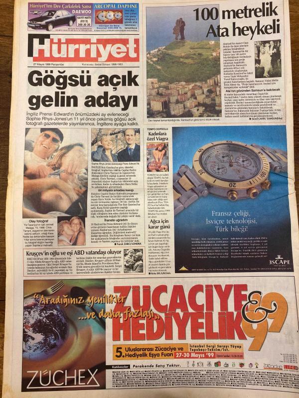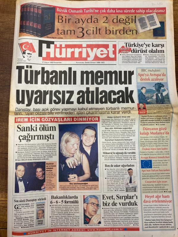 HÜRRİYET GAZETESİ DOĞUM GÜNÜ HEDİYESİ - 27 MAYIS 1999 -TAM TAKIM 40 SAYFADIR -İrem Uğur Ergan-Ertuğrul Özkök-Oktay Ekşi-Org Hüseyin Kıvrıkoğlu-Sarp Apak-Sophie Rhys-Jones-Kruşçev-Ümit Karan-Murat Kemal Güner-Nora Ivanova-Pat Riley-İbrahim Kutluay-Rıdvan Dilmen-Fatih Terim-Toshack-Ismail Er-Zeki Müren-Ozan Orhon-Bekir Coşkun-Muharrem Demirel-Mustafa Koser Türbanlı memur uyarısız atılacak-İrem için gözyaşları dinmiyor-Sanki ölüm çağırmıştı-Son sözü Danıştay söyledi-Bakanlıklarda 6-6-5 formülü-Evet Sırplar’ı biz de vurduk-Türkiye’ye karşı dürüst olalım-BBC muhabiri: Apo’ya Avrupa’da destek azalıyor-Dünyanın gözü kulağı Mudanya’da-Cezavleri için çözüm-Heyet ağır bastı dava ertelenmiyor-Göğsü açık gelin adayı-100 metrelik Ata heykeli-Kruşçev’in oğlu ve eşi ABD vatandaşı oluyor-İhanete özür-Ağaç için karar günü-Cimbom perdeyi açtı-Pistte aşk-İbo Miami yolunda-Rüya takım yaratırım-Yabancılar fiyasko-Bu sene olmadı kısmetse seneye-Löw: Şampiyonluk sözü veriyorum-F B ahçe’ye Almanya kampı-Mira, AYDIN DOĞAN tarafından kaleme alınmıştır. HÜRRİYET GAZETESİ DOĞUM GÜNÜ HEDİYESİ - 27 MAYIS 1999 -TAM TAKIM 40 SAYFADIR -İrem Uğur Ergan-Ertuğrul Özkök-Oktay Ekşi-Org Hüseyin Kıvrıkoğlu-Sarp Apak-Sophie Rhys-Jones-Kruşçev-Ümit Karan-Murat Kemal Güner-Nora Ivanova-Pat Riley-İbrahim Kutluay-Rıdvan Dilmen-Fatih Terim-Toshack-Ismail Er-Zeki Müren-Ozan Orhon-Bekir Coşkun-Muharrem Demirel-Mustafa Koser Türbanlı memur uyarısız atılacak-İrem için gözyaşları dinmiyor-Sanki ölüm çağırmıştı-Son sözü Danıştay söyledi-Bakanlıklarda 6-6-5 formülü-Evet Sırplar’ı biz de vurduk-Türkiye’ye karşı dürüst olalım-BBC muhabiri: Apo’ya Avrupa’da destek azalıyor-Dünyanın gözü kulağı Mudanya’da-Cezavleri için çözüm-Heyet ağır bastı dava ertelenmiyor-Göğsü açık gelin adayı-100 metrelik Ata heykeli-Kruşçev’in oğlu ve eşi ABD vatandaşı oluyor-İhanete özür-Ağaç için karar günü-Cimbom perdeyi açtı-Pistte aşk-İbo Miami yolunda-Rüya takım yaratırım-Yabancılar fiyasko-Bu sene olmadı kısmetse seneye-Löw: Şampiyonluk sözü veriyorum-F B ahçe’ye Almanya kampı-Mira adlı eser Türkçe dilindedir.