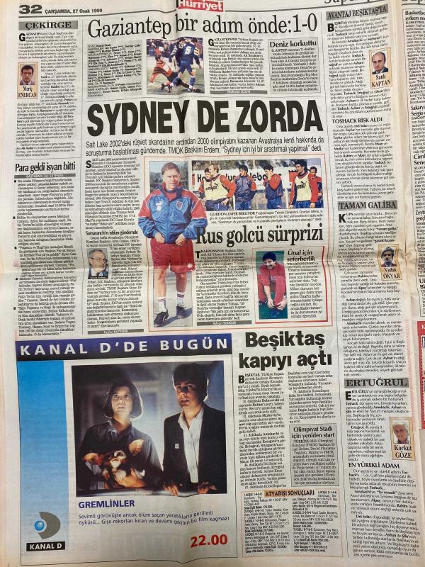 HÜRRİYET GAZETESİ DOĞUM GÜNÜ HEDİYESİ - 27 OCAK 1999 -TAM TAKIM 36 SAYFADIR -Sedat Simavi-Akıl durduran iddia-Kutan-Ordumuza en iyi niyetle bağlıyız-Oktay Ekşi-Anormal olan-Ertuğrul Özkök-Tansu Çiller-Cristian deneniyor-Toshack-Amokachi-Ersun Yanal-Faruk Süren-Popescu-Meriç Enercan-Salim Kaptan-Gordon Milne-Doğan Uluç-Ayhan Atakol-Emin Çölaşan-Halit Öztürkmen Skandal kapıda-Din istismarı MGK gündemine geliyor-Suçu ekmek çalmak-Mapustaki çocuk-Araba devrilmeden-Telekom hata faturasını cebe çıkarttı-Anormal olan-Kavgayı askıya alan şarkı-Sibel’i yumuşatan arabesk nağmeler-Sergen Fenerbahçe’de-Kartal kapıyı açtı-Amokachi sürprizi-Para geldi isyan bitti-Baş döndüren trafik-Fener’in ilk onbiri belli-Sydney de zorda-Rus golcü sürprizi-Beşiktaş kapıyı açtı-Uçağın düşüş nedeni pilotların anlaşamaması-10 bin yıl işleyecek saat-Erbakan bitmiştir Gremlins , AYDIN DOĞAN tarafından kaleme alınmıştır. HÜRRİYET GAZETESİ DOĞUM GÜNÜ HEDİYESİ - 27 OCAK 1999 -TAM TAKIM 36 SAYFADIR -Sedat Simavi-Akıl durduran iddia-Kutan-Ordumuza en iyi niyetle bağlıyız-Oktay Ekşi-Anormal olan-Ertuğrul Özkök-Tansu Çiller-Cristian deneniyor-Toshack-Amokachi-Ersun Yanal-Faruk Süren-Popescu-Meriç Enercan-Salim Kaptan-Gordon Milne-Doğan Uluç-Ayhan Atakol-Emin Çölaşan-Halit Öztürkmen Skandal kapıda-Din istismarı MGK gündemine geliyor-Suçu ekmek çalmak-Mapustaki çocuk-Araba devrilmeden-Telekom hata faturasını cebe çıkarttı-Anormal olan-Kavgayı askıya alan şarkı-Sibel’i yumuşatan arabesk nağmeler-Sergen Fenerbahçe’de-Kartal kapıyı açtı-Amokachi sürprizi-Para geldi isyan bitti-Baş döndüren trafik-Fener’in ilk onbiri belli-Sydney de zorda-Rus golcü sürprizi-Beşiktaş kapıyı açtı-Uçağın düşüş nedeni pilotların anlaşamaması-10 bin yıl işleyecek saat-Erbakan bitmiştir Gremlins  adlı eser Türkçe dilindedir.