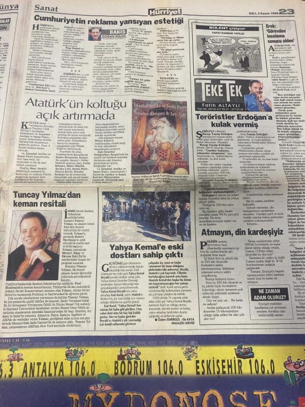 HÜRRİYET GAZETESİ DOĞUM GÜNÜ HEDİYESİ - 3 KASIM 1998 - 38 SAYFADIR -Metin Kaplan-Çiller-Oktay Ekşi-Levent Kırca-Toshack-Bebeto-Hugo Sanchez-Mehmet Yener Susoy-Sinan Özbağkan-Ebru Gündeş-Amokachi-Serdar Uluer-Yılmaz-İlhami Kaplan-Hugo Sanchez-Hüseyin Okocza-Nevzat Saygılıoğlu-Mümtaz Soysal-Çiğdem Toker-Temizel-Hülya Ağansoy-Tevfik Ağansoy-Yurdanur Serhat-Vedat Aydın-Haldun Sevel Haini istiyoruz-Çiller komisyonu bugün toplanıyor-Kayıda giren para 25 milyar dolar-Bakana ayıp-Bir arpa boyu yol aldık-Yeşili hamamda görmüşler-Kırca Ankara’da omuzlara alındı-Baştan çıkaran dergi bayilerde-Bebeto bile bekledi-Tekrar istiyoruz-Amokachi 1 ay yok-Türkiye çok güzeldi-Sert erkeği severim-Ben güzel değilim-25 milyar dolar kayda girdi-Türkiye karaparada ikinci sınava giriyor-Temizel: Her şeye karapara diyemeyiz-ABD: Bakü-Ceyhan ağırlık kazandı-Susurluk: Geride kalan kadınlar-Katli kabir komşusu-Öldürmemek elinde değildi Karikatür-çizer isimleri: Ustura Kemal-Bin Yaşasın Gazi Paşa-Haldun Sevel, Aydın Doğan tarafından kaleme alınmıştır. HÜRRİYET GAZETESİ DOĞUM GÜNÜ HEDİYESİ - 3 KASIM 1998 - 38 SAYFADIR -Metin Kaplan-Çiller-Oktay Ekşi-Levent Kırca-Toshack-Bebeto-Hugo Sanchez-Mehmet Yener Susoy-Sinan Özbağkan-Ebru Gündeş-Amokachi-Serdar Uluer-Yılmaz-İlhami Kaplan-Hugo Sanchez-Hüseyin Okocza-Nevzat Saygılıoğlu-Mümtaz Soysal-Çiğdem Toker-Temizel-Hülya Ağansoy-Tevfik Ağansoy-Yurdanur Serhat-Vedat Aydın-Haldun Sevel Haini istiyoruz-Çiller komisyonu bugün toplanıyor-Kayıda giren para 25 milyar dolar-Bakana ayıp-Bir arpa boyu yol aldık-Yeşili hamamda görmüşler-Kırca Ankara’da omuzlara alındı-Baştan çıkaran dergi bayilerde-Bebeto bile bekledi-Tekrar istiyoruz-Amokachi 1 ay yok-Türkiye çok güzeldi-Sert erkeği severim-Ben güzel değilim-25 milyar dolar kayda girdi-Türkiye karaparada ikinci sınava giriyor-Temizel: Her şeye karapara diyemeyiz-ABD: Bakü-Ceyhan ağırlık kazandı-Susurluk: Geride kalan kadınlar-Katli kabir komşusu-Öldürmemek elinde değildi Karikatür-çizer isimleri: Ustura Kemal-Bin Yaşasın Gazi Paşa-Haldun Sevel adlı eser Türkçe dilindedir.