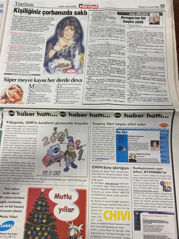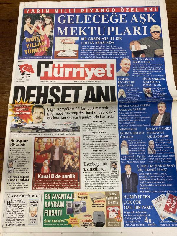 HÜRRİYET GAZETESİ DOĞUM GÜNÜ HEDİYESİ - 31 ARALIK 2000 -TAM TAKIM 28 SAYFADIR -Ertuğrul Özkök-Oktay Ekşi-Murat Bardakçı-Halis Serbest-Karen Jardel-Mario Jardel-Yusuf Şimşek-Serhat Akın-Fevzi Tuncay-Salih Uçan-Mehmet Arslan-Metin Sertoğlu-Cavit Demirbilek-Özcan Mutlugil-Ünal Özyürek-Cem Davran-Uğur Yücel-Vekaterina Rednikova-Robert De Niro-Ben Stiller-Samuel L. Jackson-Bülent Akarcalı-Numan-Ahmet Yavuz Geleceğe Aşk Mektupları-Bir Graduate ile Bir Lolita Arasında-Bize Kalan Aşk Bir Rüyadır-Ceketin Recai’ye Bol Geldi-Şimdi Şarkılar Aşklardan Daha Uzun-Benim Nazlı Yarim Sağlam Paralardır-Dehşet Anı-Jumbonun Kaptanı Anlatıyor-Shakespeare Bile Anladı-2001 Yılının Yıldızı 3 Savaş 3 Suikast-Yılın Son Gününde Uçmak-Kanal D’de Şenlik-Esenboğa Bir Hizmetin Adı-Memelerini Ekinle Birlikte Özledim-İşkence Altında Alınmayan Aşk İfade midir-Çünkü Kuşlar İnsana Hiçbir Şey Anlatmaz-Faksla Şip-Şak Rapor-Çok Para İstediler-Kaza Yapmadım Düştüm-Serhat Jet Gibi-Avrupa’nın Aslanı-Efes Sarhoş Etti-Mutlu Yıll, AYDIN DOĞAN tarafından kaleme alınmıştır. HÜRRİYET GAZETESİ DOĞUM GÜNÜ HEDİYESİ - 31 ARALIK 2000 -TAM TAKIM 28 SAYFADIR -Ertuğrul Özkök-Oktay Ekşi-Murat Bardakçı-Halis Serbest-Karen Jardel-Mario Jardel-Yusuf Şimşek-Serhat Akın-Fevzi Tuncay-Salih Uçan-Mehmet Arslan-Metin Sertoğlu-Cavit Demirbilek-Özcan Mutlugil-Ünal Özyürek-Cem Davran-Uğur Yücel-Vekaterina Rednikova-Robert De Niro-Ben Stiller-Samuel L. Jackson-Bülent Akarcalı-Numan-Ahmet Yavuz Geleceğe Aşk Mektupları-Bir Graduate ile Bir Lolita Arasında-Bize Kalan Aşk Bir Rüyadır-Ceketin Recai’ye Bol Geldi-Şimdi Şarkılar Aşklardan Daha Uzun-Benim Nazlı Yarim Sağlam Paralardır-Dehşet Anı-Jumbonun Kaptanı Anlatıyor-Shakespeare Bile Anladı-2001 Yılının Yıldızı 3 Savaş 3 Suikast-Yılın Son Gününde Uçmak-Kanal D’de Şenlik-Esenboğa Bir Hizmetin Adı-Memelerini Ekinle Birlikte Özledim-İşkence Altında Alınmayan Aşk İfade midir-Çünkü Kuşlar İnsana Hiçbir Şey Anlatmaz-Faksla Şip-Şak Rapor-Çok Para İstediler-Kaza Yapmadım Düştüm-Serhat Jet Gibi-Avrupa’nın Aslanı-Efes Sarhoş Etti-Mutlu Yıll adlı eser Türkçe dilindedir.