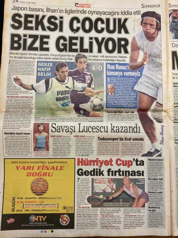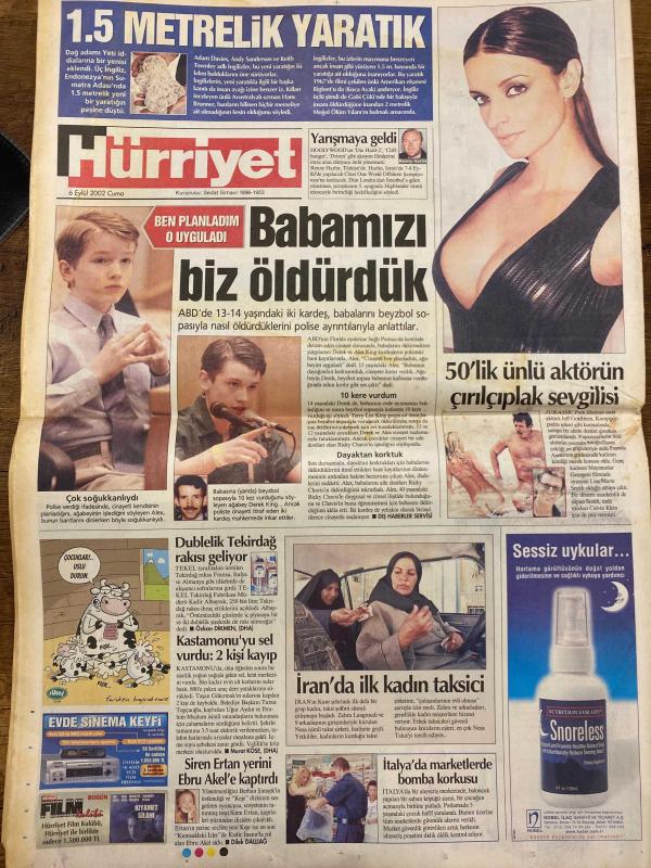 HÜRRİYET GAZETESİ DOĞUM GÜNÜ HEDİYESİ - 6 EYLÜL 2002 -TAM TAKIM 38 SAYFADIR -Recep Tayyip Erdoğan-Emine Erdoğan-Hülya Avşar-Demet Akbağ-Bülent Ecevit-Süleyman Demirel-Oktay Ekşi-Ertuğrul Özkök-Verheugen-Gürsel Aytaç-Adam Davis-Sanderson-Keith Tomayko-Ricky-Charlize Theron-Mirsad Türkcan-Hidayet Türkoğlu-Hüseyin Beşok-Ahmet Kabahasanov-Ahmet Kalkan-Ahmet Kurtuluş-Ahmet Kayaoglu-Hüseyin Özbey-Hüseyin Beşok-Hüseyin Kabataş-Selami Özdemir-Şeref Has-Can Çobanoğlu-Hasan Şaş-Sabancı-Terim-Süreyya Ayhan-Burhan Uslu-İlhan Mansız-Nakata-Sunny Side-Up-Lucescu-Mirza Mansiz-Sumiy Sede-Ümit Davala-Miroslav Stevic-Kalou Çöküşün 5 nedeni-Steril çadırda yaşıyordu artık özgür-Gen tedavisinin mucize çocuğu-Hülya: En çirkini oydu-Purodan ağzı yandı sigarayı bıraktı-Demet Akbağ Kanal D’de-Emine Hanım taahhüdü-Yaz okulunun tuhaf hocaları-Hoca’dan Tayyip’e oy verme mektubu-HADEP yedi DEHAP’a kaçtı-Suikastten kurtuldu-Açıklamalı yazı-YÖK’ten Türkçe harç-Yüzde 62 dışarda-1.5 metrelik yaratık-Babamızı biz öldü adlı eser, Kitap > Süreli Yayınlar > Gazeteler > Türkiye > Genel > Günlük kategorisinde İkinci El olarak satıştadır.