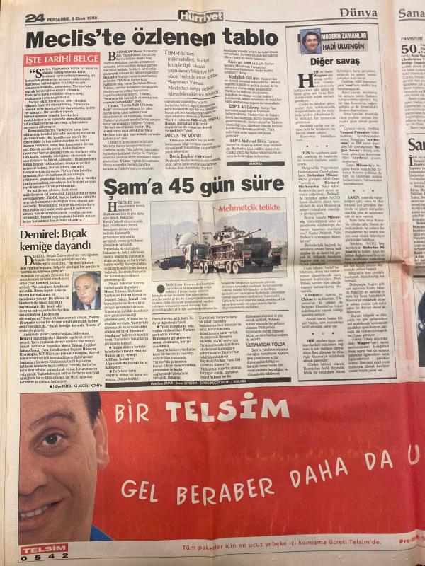 HÜRRİYET GAZETESİ DOĞUM GÜNÜ HEDİYESİ - 8 EKİM 1998 -TAM TAKIM 46 SAYFADIR -Nesim Malki-Çakıcı-Hafız Esad-Mübarek-Süleyman Demirel-Ertuğrul Özkök-Oktay Ekşi-Mustafa Denizli-Tugay-Mustafa Doğan-Bierhoff-Toshack-Turgay Rasit-Joachim Löw-Tugrul Şener-İlhan Söyler-Niran Ünsal-Murat Göğebakan-Muazzez Abacı-Mehmet Esen-Mehmet Ali Erbil-Enis Berberoğlu-Zekeriya Temizel-Korkmaz Kökor-Nazan Özenç-Baki Çol-Hülya Avşar-Gülden Aydın-Sibel Erarslan-Kezban Hatemi-Filiz Koçali-Haldun Sevel Malki Bombası-Bantlar Aydınlattı-Sam’a 45 Gün Süre-Meclis’te Özlenen Tablo-Buyurun Sayın Başkan-Dünyaya Anlatılacak-Demirel Bıçak Kemiğe Dayandı-Silahın Yüzde 73’ü Hurda-İlginç Bir Değişiklik-Geri Sayım Başladı-Bize Biraz İnsaflı Davranın-Bierhoff İddialı-İşime Karışamazlar-Dadaş Alarmı-Löw’den Cuma Maçına İsyan-Alacakaranlık-Kasaba-Atlara Fısıldayan Adam-Kirli Yarış-Armageddon-Maviya-Murat Göğebakan Konseri-Bırakılmayan Azizlükler-Bak Şu Konuşana Çılgın Gösteri-Temizel Karapara EFT ile Dünyayı Dolaşıyor-Rüşveti Ö adlı eser, Kitap > Süreli Yayınlar > Gazeteler > Türkiye > Genel > Günlük kategorisinde İkinci El olarak satıştadır.