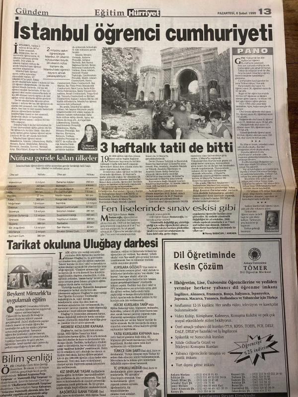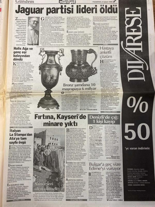 HÜRRİYET GAZETESİ DOĞUM GÜNÜ HEDİYESİ - 8 ŞUBAT 1999 -TAM TAKIM 38 SAYFADIR -Kral Hüseyin-Kaddafi-Baykal-Kutan-Zsa Zsa Gabor-Ertuğrul Özkök-Ahmet Kaya-Fatih Terim-Hagi-Turgay Şeren-İlhan Soyler-Bayram Aydın-Halit Özkan-Sergen-Hakem Zaman-Toshack-Tayyar Safi-Oral Atlı-Ecevit-Sayın Gazeteci Nurettin Kurt-Nazlı Altınyar-Uğur Yazar-Nuran Çakmakcı Ortadoğu ağlıyor-PKK başladığı yerde bitiyor-Majesteleri unvanı gitti-Yeni kral Türk dostu-Türkiye Ürdün gizli ortaklığı-Balayından dönüş-Zsa Zsa Gabor beni 3-5 ay eve kapattı-Osmanlı daveti-Apo Simitis’i bayılttı-Hagi’nin doğum günü partisi-Aslan coştu bir kere-Terim Tugay’ı kızağa oturttu-Formam namusumdur-Boğa 90’da vurdu-Sakarya bombaladı-Adana Dadaş’ı Cenk’le devirdi-Jaguar partisi lideri oldu-Halis Ağa ve genç eşi balayından döndü-Fırtına Kayseri’de minare yıktı-Denizli’de çığ 1 kişi kayıp-Bulgarlar geç vize Edirne’yi vuruyor-İstanbul öğrenci cumhuriyeti-3 haftalık tatil de bitti-Tarikat okuluna Uluğbay darbesi, AYDIN DOĞAN tarafından kaleme alınmıştır. HÜRRİYET GAZETESİ DOĞUM GÜNÜ HEDİYESİ - 8 ŞUBAT 1999 -TAM TAKIM 38 SAYFADIR -Kral Hüseyin-Kaddafi-Baykal-Kutan-Zsa Zsa Gabor-Ertuğrul Özkök-Ahmet Kaya-Fatih Terim-Hagi-Turgay Şeren-İlhan Soyler-Bayram Aydın-Halit Özkan-Sergen-Hakem Zaman-Toshack-Tayyar Safi-Oral Atlı-Ecevit-Sayın Gazeteci Nurettin Kurt-Nazlı Altınyar-Uğur Yazar-Nuran Çakmakcı Ortadoğu ağlıyor-PKK başladığı yerde bitiyor-Majesteleri unvanı gitti-Yeni kral Türk dostu-Türkiye Ürdün gizli ortaklığı-Balayından dönüş-Zsa Zsa Gabor beni 3-5 ay eve kapattı-Osmanlı daveti-Apo Simitis’i bayılttı-Hagi’nin doğum günü partisi-Aslan coştu bir kere-Terim Tugay’ı kızağa oturttu-Formam namusumdur-Boğa 90’da vurdu-Sakarya bombaladı-Adana Dadaş’ı Cenk’le devirdi-Jaguar partisi lideri oldu-Halis Ağa ve genç eşi balayından döndü-Fırtına Kayseri’de minare yıktı-Denizli’de çığ 1 kişi kayıp-Bulgarlar geç vize Edirne’yi vuruyor-İstanbul öğrenci cumhuriyeti-3 haftalık tatil de bitti-Tarikat okuluna Uluğbay darbesi adlı eser Türkçe dilindedir.