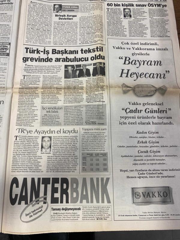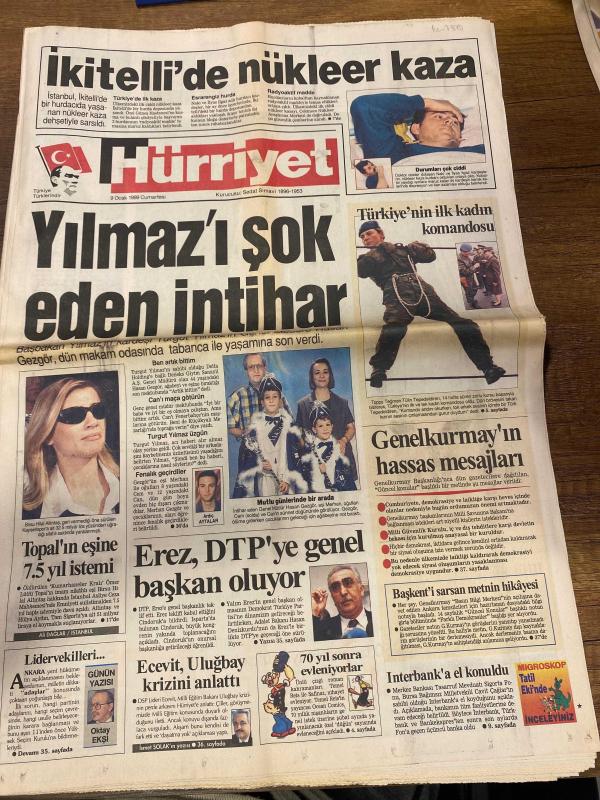 HÜRRİYET GAZETESİ DOĞUM GÜNÜ HEDİYESİ - 9 OCAK 1999 -TAM TAKIM 42 SAYFADIR -Hülya Avşar-Erez-Bülent Ecevit-Hikmet Ulugbay-Oktay Ekşi-Arda Atalay-Turgay Şeren-Abdülkadir Özgenç-Ali Şen-Rüştü Reçber-Balic-Löw-Sadi Kemal Yaşar-Süleyman Seba-Fatih Terim-Hakan Şükür-Burak-İlhan Söyler-Beyhan Güven-Sadık Albayrak-Sadık Korkmaz-Enis Berberoğlu-Hayyam Garipoğlu-Eren Kıpcı-Ebru Baki-Leman Küçükdevlet İkitelli’de nükleer kaza-Yılmaz’ı şok eden intihar-Türkiye’nin ilk kadın komandosu-Topal’ın eşine 7.5 yıl istemi-Erez DTP’ye genel başkan oluyor-Ecevit Ulugbay krizini anlattı-Genelkurmay’ın hassas mesajları-Başkent’i sarsan metnin hikayesi-İnterbank’a el konuldu-Lidervekilleri-Günün yazısı-N’olur bana kıymayın-Hakan’ı vermezler-Kongre yasal değil-2000’de gidiyorum-Cimbom şahane-Bunlar da geçer-Beşiktaş tam gaz-Bir kez kararlı-Nükleer dehşet-Uzmanlar ciddi boyutlarda radyoaktif bir kaza-Radyasyon nedir-Kobalt gama ışınları saçıyor-Atom enerjisi tüketimcilerin görüşü-Yiğit stresi atlatamamış-Asıl m, AYDIN DOĞAN tarafından kaleme alınmıştır. HÜRRİYET GAZETESİ DOĞUM GÜNÜ HEDİYESİ - 9 OCAK 1999 -TAM TAKIM 42 SAYFADIR -Hülya Avşar-Erez-Bülent Ecevit-Hikmet Ulugbay-Oktay Ekşi-Arda Atalay-Turgay Şeren-Abdülkadir Özgenç-Ali Şen-Rüştü Reçber-Balic-Löw-Sadi Kemal Yaşar-Süleyman Seba-Fatih Terim-Hakan Şükür-Burak-İlhan Söyler-Beyhan Güven-Sadık Albayrak-Sadık Korkmaz-Enis Berberoğlu-Hayyam Garipoğlu-Eren Kıpcı-Ebru Baki-Leman Küçükdevlet İkitelli’de nükleer kaza-Yılmaz’ı şok eden intihar-Türkiye’nin ilk kadın komandosu-Topal’ın eşine 7.5 yıl istemi-Erez DTP’ye genel başkan oluyor-Ecevit Ulugbay krizini anlattı-Genelkurmay’ın hassas mesajları-Başkent’i sarsan metnin hikayesi-İnterbank’a el konuldu-Lidervekilleri-Günün yazısı-N’olur bana kıymayın-Hakan’ı vermezler-Kongre yasal değil-2000’de gidiyorum-Cimbom şahane-Bunlar da geçer-Beşiktaş tam gaz-Bir kez kararlı-Nükleer dehşet-Uzmanlar ciddi boyutlarda radyoaktif bir kaza-Radyasyon nedir-Kobalt gama ışınları saçıyor-Atom enerjisi tüketimcilerin görüşü-Yiğit stresi atlatamamış-Asıl m adlı eser Türkçe dilindedir.