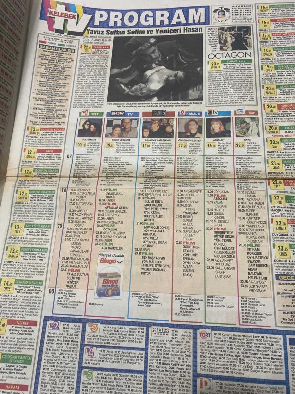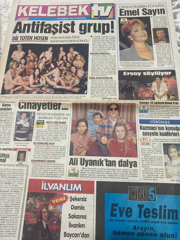 HÜRRİYET GAZETESİ HÜRRİYET KELEBEK TV GAZETESİ - 15 Haziran 1994 - Gündüz Tezmen-koç-Aslan-yay-boğa-Başak-oğlak-ikizler-Terazi-kova-yengeç-akrep-balık-Muhteşem Nejad-Güzin Abla-güngörmüşler-bizimkiler-fatoş-dedektif Nik-Cengiz Semercioğlu-Yıldırım Cavlı-Selim Genç-Express haber ajansı-çarşı mağazaları-Türkiye eğitim vakfı-tekno data-Pimapen—cesur ve güzel-donanma kaplanları-öğretmen Zeynep-Hülya Avşar-Savcı-Kadir İnanır-Yavuz Sultan Selim ve yeniçeri Hasan-Ayla Karaca-Münir Özkul-Ayhan Işık-Güler kazmacı-Cem kurtoğlu-anti faşist grup-Die toten hosen-mehbare Çelik-Bülent Ersoy- adlı eser, Kitap > Süreli Yayınlar > Gazeteler > Türkiye > Genel > Günlük kategorisinde İkinci El olarak satıştadır.