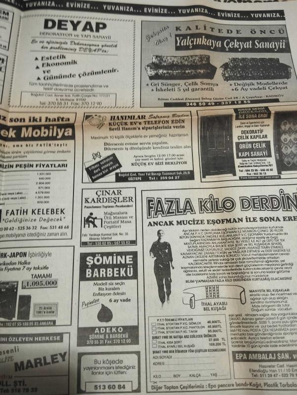 HÜRRİYET GAZETESİ HÜRRİYET KELEBEK TV GAZETESİ - 17 Aralık 1991- Hasan çapan-ibrahim çapan-elif Kıramer- çapkınların acı kaybı- Doçent Doktor Özer Ergün- Adnan Menderes- bingo- Fatma batukan-imparatorluğu hazırlanıyor-garip hırsızlık-julie canton- plastip şova taze kan- vasiyetname-hürriyet-trt- Uğur dündar-şantaj- çeşitleme-muzaffer Ertürk- Nuri ergün-ayhan ışıksu çizgi Arzu Okay- 1991 komedisi-karşı karşıya- enis Fosforoğlu- tutku-bilmemek ayıp değil-azize bergin-corci-alo ilhan irem-mary cohr- alışveriş rehberi-büyük altın kampanyası-deri giyinme özpanda kalitesi-izmirli kürk sarayı-idem-arapça- murat Sürücü Kursu- Yeni yılda da bulaşık mı yıkayacaksınız- İsak tombul-burak profil-hakan marley adlı eser, Kitap > Süreli Yayınlar > Gazeteler > Türkiye > Genel > Günlük kategorisinde İkinci El olarak satıştadır.
