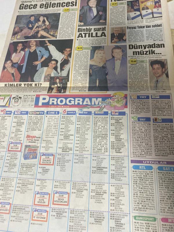 HÜRRİYET GAZETESİ HÜRRİYET KELEBEK TV GAZETESİ - 5 Aralık 1993 -Gündüz Tezmen-koç-Aslan-yay-boğa-Başak-oğlak-ikizler-Terazi-kova-yengeç-akrep-balık-Muhteşem Nejad-Güzin Abla-güngörmüşler-bizimkiler-fatoş-dedektif Nik-Cengiz Semercioğlu-Yıldırım Cavlı-Halil evlendi-aranıyor-liseler arası bilgi yarışması-müzik sohbeti-günün filmleri-televizyon yıldızları-müzik sohbeti-filiz Öcal-Sevgi sözcükleri-katil gözler-çapraz ateş-yıkılış-cadı Dağı'nın ardında-karnaval çocuğu-seni seviyorum Alice-haftanın virüsü-mega medyum Mehmet-acil Servisi-virüs-dünyadan müzik-binbir sürat Atilla-gece eğlencesi-potadaki gururumuz-kimler yok ki-Ekrembat-Erol Işık-Timur işıkçı adlı eser, Kitap > Süreli Yayınlar > Gazeteler > Türkiye > Genel > Günlük kategorisinde İkinci El olarak satıştadır.
