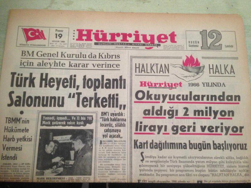 HÜRRİYET GÜNLÜK MÜSTAKİL SİYASİ GAZETE - 19 ARALIK 1965 - TÜRK HEYETİ TOPLANTI SALONUNU TERKETTİ, 6 yıl önce satışa sunulmuştur.