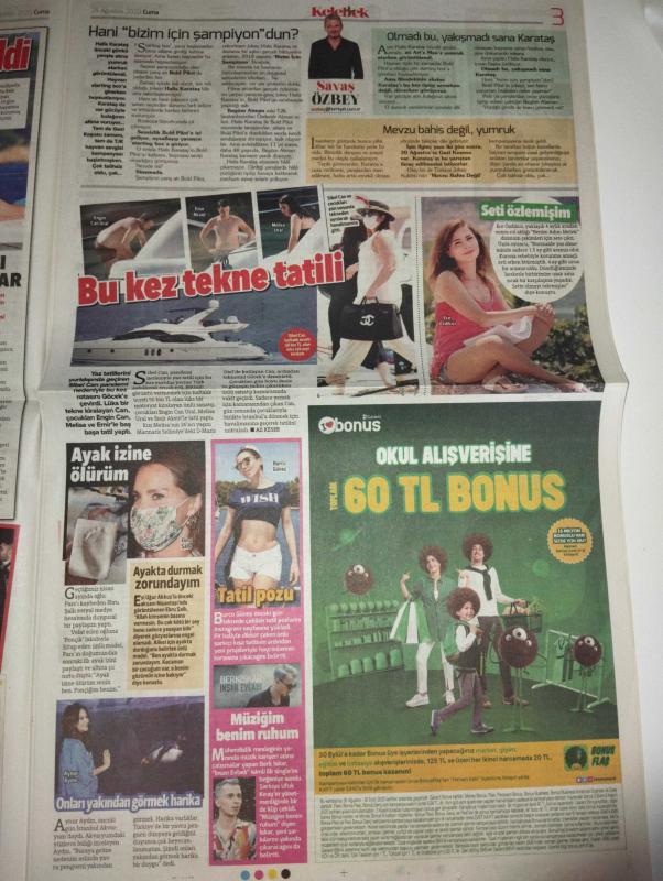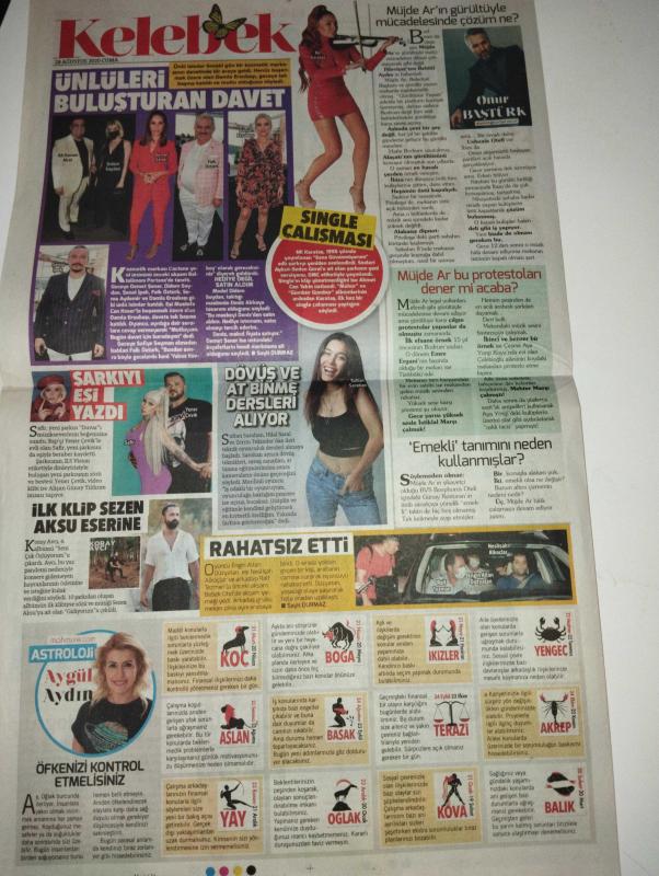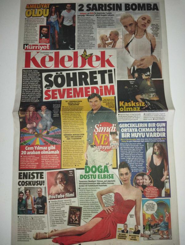 HÜRRİYET KELEBEK GAZETESİ -28 Ağustos 2020-Bensu soral-Hakan baş-Gülşen-Edis-Oğulcan Engin-Ezgi Eyüboğlu-Cem Yılmaz-Metin Sezgin-Hakan Yılmaz-Mufti Can Saçıntı-Eda Solmaz-Merve Sarıçoğlu-Berk Oktay-Cem Yılmaz-Neslihan Yılmaz-Çiğdem Batur-Neslihan Atagül-Kadir Doğulu-Hakan Sabancı-Buse Terim-Selhan Aloğlu-Alexis Gulliver-Aslıhan Çalışkan-Evren Vural-Özlem Yüksek-Merve Oflaz-Alen Hakko-Janset-Tarık Tarcan-Müge Arlı-Hülya Avşar-Gülşen Bubikoğlu-Lale Başar-Sevtap Parman-Hülya Demir Oktay-Emine Erdoğan-Mevlüt Çavuşoğlu-Berat Albayrak-Süleyman Soylu-Ali Osman Akat-Demet Şener-Metin Özülkü-Yener Çevik-Safir-Kozy Avcı-Sezen Aksu-Sait Emir-Alkan Akay-Serkan Altunorak-Hanifi Saraç-Zerrin Tekindor-Neslihan Alkoclar-Şöhreti Sevemedim-Gerçeklerin Bir Gün Ortaya Çıkmak Gibi Bir Huyu Vardır-Güzel Oyuncu Nazara Geldi-Pandemi Ayırmıştı Yeniden Bir Aradalar-Eşi En Önden İzledi-Aramızda Bir Şey Yok-Ünlü Olmaya Asla Uyum Sağlayamadım-Malazgirt’te Büyük Buluşma-Basrol Beklediğimi Sanıp Rol Vermiyorlar adlı eser Türkçe dilindedir. Eserin içeriğinde Türkçe dilinde bölümlere de yer verilmektedir.