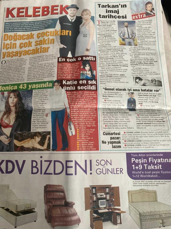 HÜRRİYET KELEBEK GAZETESİ DOĞUM GÜNÜ HEDİYESİ - 22 ARALIK 2007 - Elif Turan-Iveta lutovska-mahsun Kırmızıgül-sarpa apak-Big yıldırımer-Cengiz Semercioğlu-Onur baştürk-Mevlüt tezel-Hande Yener-Bengü-Mustafa Sandal-Emina Türkcan—Deniz uğur-Tamer Karadağlı-Zerrin Özer-Göksel-Mutlu konser-Alp kırşan-Alper erinç-Fatih Ürek-Sami Levide-Ferhat Göçer-Kubilay keskin-Esra Üstünkaya-Esra Eron-rafi portakal-maya portakal-analia marecos-grigoria antoniou-Ayşe altın Önal-Teoman-kutsi-mahsun Kırmızıgül-Celal Çapa-Yüksel Çin-Fadik Sevim Atasoy-Beyaz Melek beni panik atak yaptı-hamam kültürüne yeni yorum-Melda narmanlı Çimen-Alpay atalan-Selen Seyven-Faik ergin-Hazal Kaya-Mehmet Ali Bilal-Nebil Özgentürk-gripin-Halit Kıvanç-maskeli beşler Irak-Peker açıkalın-Şafak Sezer-Cengiz Küçükayvaz-Melih ekener-Yalçın pekşen-latif Demirci-Abdullah Şahin-Selena dizisi-Ayşe kulin-Esen Gürel-Sinem Vural-alp kırşan-mischa barton-lily allen-jessica simpson-noibe yazıyor-tekin acar cosmetics-Nilüfer Pazvantoğlu-Sahrap adlı eser, Kitap > Süreli Yayınlar > Gazeteler > Türkiye > Genel > Günlük kategorisinde İkinci El olarak satıştadır.