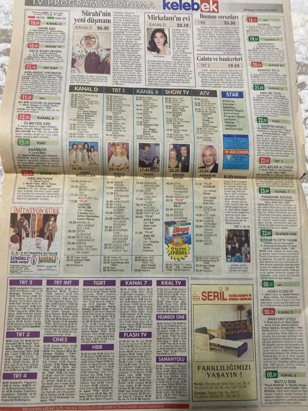 HÜRRİYET KELEBEK GAZETESİ MAGAZİN EKİ DOĞUM GÜNÜ HEDİYESİ (TURKISH NEWSPAPPER) - 29 KASIM 1995 - SADECE 4 SAYFADIR -Uğur Dündar-Ayşe Arman-Deniz Baykal-Necdet Menzir-Merve-Mehmet Ali-Haluk Şahin-Ali Namık-Aydın Özdalga-Sean Bean-Berrin Politi-Melanie Hill-Lori-Molly-Hayri Caner-Cemal Dündar-Azize Bergin-Gündüz Tezmen-Semih Cankurt-Sertab Erener-H.Schmidt-Kemal Çağlar-Güllü Çeliktaş-Binnaz Aydın-Yusuf Toker-Nursun Ünlü-A.Tahsin Çetin-Murat Akar-Esin Talinli-Aykut Çınar-Ufuk Karakoç-Gökhan Yaşar-Anjelik Uygan-Ayhan Ahiskal-Jak Fermon-Julia Roberts-Robert Duvall-Dennis Quaid-Lasse Hallstrom-Clint Eastwood-Meryl Streep-Gülen Palyaço Ağlayan Pinokyo-Keloğlan-Meg Ryan-Kevin Kline-Lawrence Kasdan-Faruk Erem-Rutkay Aziz-Stallone-Armand Assante-Diane Lane-Mel Gibson-Sophie Marceau-Martin Lawrence-Will Smith-Tea Leoni-Michael Bay-Bruce Willis-Jeremy Irons-Samuel L. Jackson-John McTiernan-Meryl Streep-Glenn Close-Jeremy Irons-Bille August-Kevin Costner-Kevin Reynolds-Denzel Washington-Gene Hackma adlı eser, Kitap > Süreli Yayınlar > Gazeteler > Türkiye > Genel > Günlük kategorisinde İkinci El olarak satıştadır.