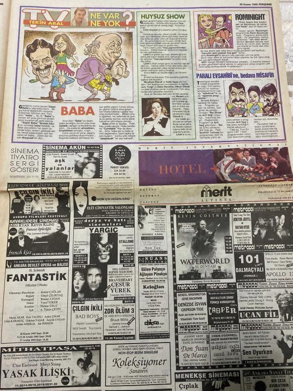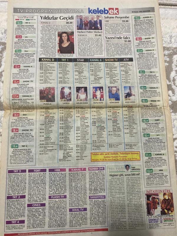 HÜRRİYET KELEBEK GAZETESİ MAGAZİN EKİ DOĞUM GÜNÜ HEDİYESİ (TURKISH NEWSPAPPER) - 30 KASIM 1995 - SADECE 4 SAYFADIR -Mithat Bereket-Ayler Dedekorkut-Nihan Özyıldırım-Can İzbul-Göksel Kesici-Özer Bereket-Nazan Gezer-Tekin Biçer-Müge Ay-Sacit Baydar-Sinan Vural-Derya Sazak-Can Dündar-Meryem Recevi-Tekin Aral-Perin Karaali-Cenk Ertan-Neslihan Akbaydar-Filiz Öcal-Hayri Caner-Cemal Dündar-Dr. Gündüz Tezmen-Güzin Abla-Azize Bergin-Sertab Erener-Huysuz Show-Linet-Gülttü Agop-Yorgo-Aleko Bacanos-Dikran Efendi-Arif Sağ-Erol Evgin-İbrahim Tatlıses-Kevin Costner-Mel Gibson-Sophie Marceau-Bruce Willis-Jeremy Irons-Samuel L. Jackson-John Travolta-Johnny Depp-Marlon Brando-Faye Dunaway-Chris O'Donnell-Drew Barrymore-Sandra Bullock-Bill Pullman-Pamela Prati-Lorenzo Santamaria-Tuncay Özkan-Funda Eskioğlu-Aysun Akman-Levent Güner-Kaya Akarsu-Yıldız Tilbe-Hakan Peker-Sibel Can-Sibel Alaş-Safiye Soyman-Muazzez Abacı-Sertaç-Mithat Baydur-Mümtaz Soysal-Cengiz Semercioğlu-Tayfun Akgüner-İranlı kadın muhalifl adlı eser Türkçe dilindedir.