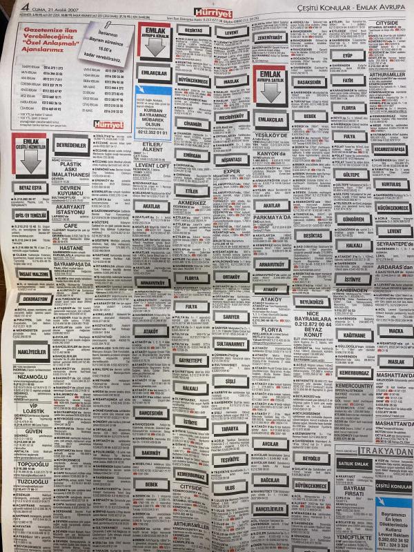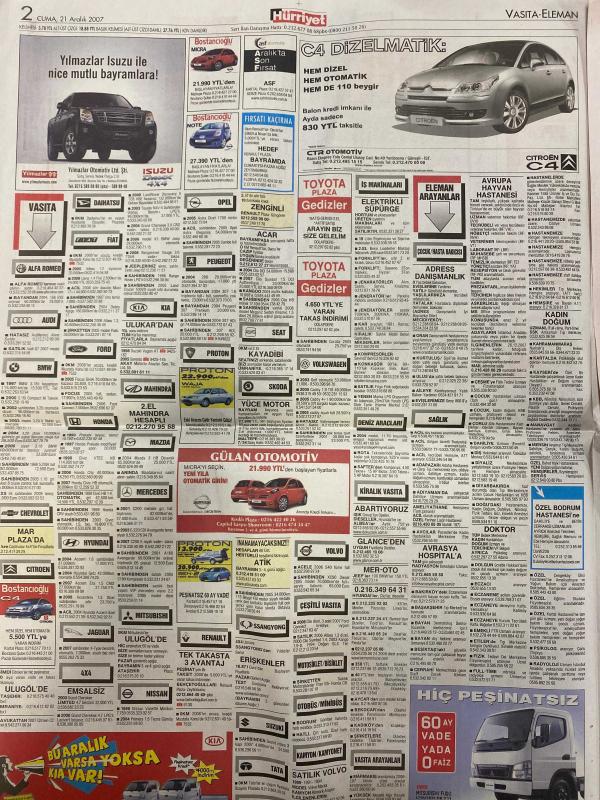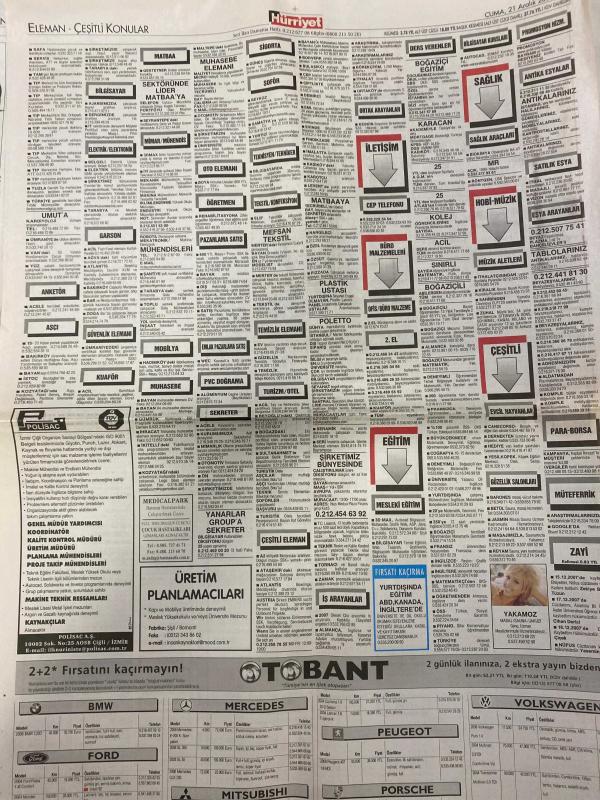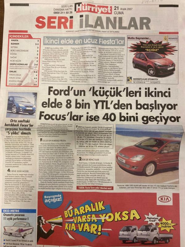 HÜRRİYET SERİ İLANLAR GAZETESİ DOĞUM GÜNÜ HEDİYESİ- 21 ARALIK 2007 - Seri ilanlar-mis gibi takas fırsatı-eski evini ver yenisini hemen al-mavi kale-eleman-büro malzemeleri-eğitim-sağlık-çeşitli konular-çiçekçiler-kuaförler-kuru temizleme-evcil hayvan hayvanlar-güzellik salonları-tercüme ofisi-promosyon hizmetleri-eşya arayanlar-para-borsa-emlak-Avrupa yakası kiralık-Avrupa yakası satılık-Anadolu yakası kiralık-Anadolu yakası satılık-plaza çalışanları yürüme mesafesinde eve kavuşacak-Koluman-Gedizler-Volkswagen-Skoda-Nissan-bostancıoğlu-Akbank-Jaguar-Citroen-Mercedes-Mazda-Erpaş otomotiv-Hyundai-kaynak otomotiv-sigorta-Avcılar-Ortaköy-Kağıthane-güvenlik-Emirgan-etiler-Beylikdüzü-Beşiktaş-Ataköy-Çengelköy-Maltepe-Göztepe-Ataşehir-moda-Suadiye-Çengelköy-gıda üretim fabrikası-Ankara-Çatalca-zeytinlik-Bozcaada-Bağdatlılar otomotiv-Fordun küçükleri ikinci elde 8000 YT TL’den başlıyor Focuslar ise 40.000’i geçiyor-orta sınıftaki hatchback Focus lar çarpışma testinde beş yıldız almıştı-otomot adlı eser Türkçe dilindedir. Eserin içeriğinde Türkçe dilinde bölümlere de yer verilmektedir.