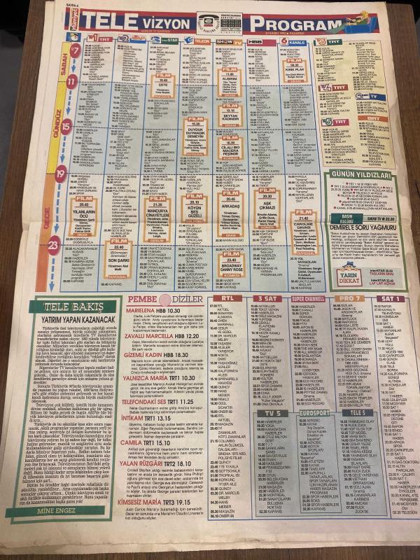 HÜRRİYET TELE VİZYON GÜNLÜK TV GAZETESİ DOĞUM GÜNÜ GAZETESİ - 30 KASIM 1992 - Tayyar yıldız-Polis dizisi Cüneyt Arkın-Ceren Akıllıoğlu-Hülya Uğur-Nergis Arı-Hülya Uğur-Taner Şener-Güneri Cıvaoğlu-Süleyman Demirel-Alcatraz Kuşçusu-Nezahat Bayram-Bülent Oral-Selami Şahin-Kevin Harris-Baba oğul aynı kıza aşık olursa-Pederin Günahları-Yılmaz Güney-Kerim Afşar-Melike Demirağ-James Coburn-Frank Sinatra-Laurence Harvey-Türkan Şoray-Nevresim icat oldu yorgan bozuldu-Sinan Özbalkan-Luc McShane-Fatma Batukan-Atilla mefruşat-Plasmen Fabrikası-Cengiz Özmen-Celalettin akyüz-Nalan Kayhan-Serpil Barlas-Kabuslara paydos-eleştiriye tıkalı kulaklar-Sevgili güzin abla-Muhteşem Nejad-Gündüz Tezmen-Azize Bergin-Ata Nirun-Astroloji-direksiyonda ojeli parmaklar-Hande Öğüt-Leyla Ağaçkoparan-Lında Evans-Burt Reynolds-Erol Evgin-Bülent Osma-Boy george-Murat Kürüz-Ümit Volkan-Yasemin Koşal-Sibel Tan-Şükrü Türen-Pembe Diziler-Tele Bakış adlı eser, Kitap > Süreli Yayınlar > Gazeteler > Türkiye > Genel > Günlük kategorisinde İkinci El olarak satıştadır.