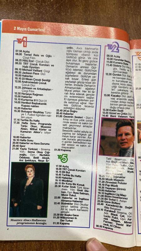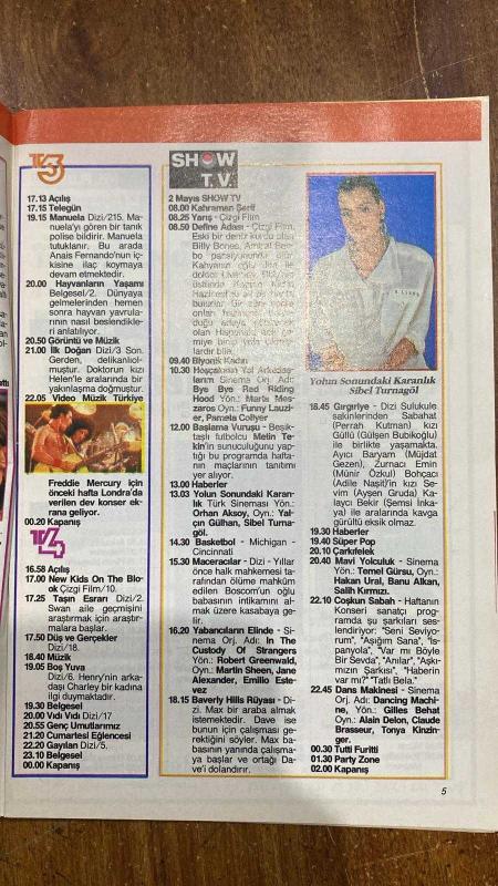HÜRRİYET TELESKOP TRT, ÖZEL TELEVİZYONLAR VE UYDU PROGAMLARI DERGİSİ - 2/8 MAYIS 1992 - FREDDIE MERCURY ANMA KONSERİ – YALAN RÜZGARI – KARTPOSTAL ARMAĞANI – MANUELA – GİZEMLİ KADIN – DALLAS – HAYVANLARIN YAŞAMI – İLK DOĞAN – VIDEO MÜZİK TÜRKİYE – NEW KIDS ON THE BLOCK – TAŞIN ESRARI – DÜŞ VE GERÇEKLER – BOŞ YUVA – VIDI VIDI – CUMARTESİ EĞLENCESİ – GAVILAN – KAHRAMAN ŞERİF – DEFINE ADASI – HOŞÇAKALAN YOL ARKADAŞLARIM – BAŞLAMA VURUŞU – YOLUN SONUNDAKİ KARANLIK – BASKETBOL MICHIGAN–CINCINNATI – MACERACILAR – YABANCILARIN ELİNDE – BEVERLY HILLS RÜYASI – GİRGİRİYE – SÜPER POP – ÇARKIFELEK – MAVİ YOLCULUK – HAFTANIN KONSERİ – DANS MAKİNESİ – TUTTİ FRUTTİ – PARTY ZONE – TEMEL REİS VE OĞLU – HILLS END – MICHAEL - FREDDIE MERCURY – MELODY THOMAS SCOTT – CLAYTON NORCROSS – EDWARD SCOTT – JORGE MARTINEZ – ANAİS – YALÇIN GÜLHAN – SİBEL TURNAGÖL – ORHAN AKSOY – MARTIN SHEEN – JANE ALEXANDER – EMILIO ESTEVEZ – PERİHAN KUTMAN – GÜLŞEN BUBİKOĞLU – MÜJDAT GEZEN – MÜNİR ÖZKUL – ADİLE NAŞİT –- 32 SAYFA, MEHMET Y. YILMAZ tarafından kaleme alınmıştır. Eser MİNE ENGEZ editörlüğünde hazırlanmıştır. Kitap . tarafından yayınlanmıştır. 32 sayfadır. HÜRRİYET TELESKOP TRT, ÖZEL TELEVİZYONLAR VE UYDU PROGAMLARI DERGİSİ - 2/8 MAYIS 1992 - FREDDIE MERCURY ANMA KONSERİ – YALAN RÜZGARI – KARTPOSTAL ARMAĞANI – MANUELA – GİZEMLİ KADIN – DALLAS – HAYVANLARIN YAŞAMI – İLK DOĞAN – VIDEO MÜZİK TÜRKİYE – NEW KIDS ON THE BLOCK – TAŞIN ESRARI – DÜŞ VE GERÇEKLER – BOŞ YUVA – VIDI VIDI – CUMARTESİ EĞLENCESİ – GAVILAN – KAHRAMAN ŞERİF – DEFINE ADASI – HOŞÇAKALAN YOL ARKADAŞLARIM – BAŞLAMA VURUŞU – YOLUN SONUNDAKİ KARANLIK – BASKETBOL MICHIGAN–CINCINNATI – MACERACILAR – YABANCILARIN ELİNDE – BEVERLY HILLS RÜYASI – GİRGİRİYE – SÜPER POP – ÇARKIFELEK – MAVİ YOLCULUK – HAFTANIN KONSERİ – DANS MAKİNESİ – TUTTİ FRUTTİ – PARTY ZONE – TEMEL REİS VE OĞLU – HILLS END – MICHAEL - FREDDIE MERCURY – MELODY THOMAS SCOTT – CLAYTON NORCROSS – EDWARD SCOTT – JORGE MARTINEZ – ANAİS – YALÇIN GÜLHAN – SİBEL TURNAGÖL – ORHAN AKSOY – MARTIN SHEEN – JANE ALEXANDER – EMILIO ESTEVEZ – PERİHAN KUTMAN – GÜLŞEN BUBİKOĞLU – MÜJDAT GEZEN – MÜNİR ÖZKUL – ADİLE NAŞİT –- 32 SAYFA adlı eser Türkçe dilindedir.