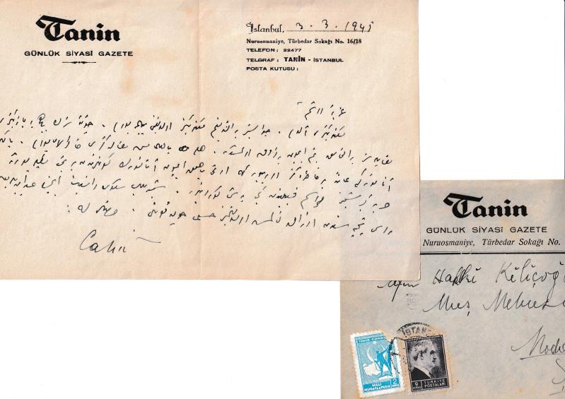 Orijinal el yazısı, tamamı Osmanlıca mektup, “Tanin: Günlük siyasî gazete” antetli kağıda ve zarfa, 22,5x15 cm, 3. 3. 1945 tarihli, “Cahit” imzalı. Hüseyin Cahit Yalçın’dan döneminin Urfa mebusu, pozitifist ve materyalist düşünceleriyle bilinen Türk düşünür ve yazar, İctihad dergisinde yayımlanan "Pek Uyanık Bir Uyku" isimli yazısıyla bilinen Hakkı Kılıçoğlu’na yazılmış, kendisinin makalesinin ve Atatürk ile ilgili hatıralarının Tanin’de yayınlanması ile ilgili mektup. Makalesinde Kılıçoğlu (Kılıçzâde), ileride Atatürk Devrimleri olarak hayata geçecek, siyaset, eğitim, kadın, din, dil, hukuk ve kılık kıyafet gibi meselelerde batıcı ve ilerici radikal önerilerini adeta bir ütopya şeklinde sunmuştur. Hüseyin Cahit Yalçın, Türk gazeteci, yazar, çevirmen, siyasetçi. Yazı hayatına Servet-i Fünûn döneminde edebiyatçı olarak başlamış, II. Abdülhamit, II. Meşrutiyet, Mütareke, Atatürk, İsmet İnönü ve Demokrat Parti dönemlerinde her daim sert kalemiyle yazdığı polemik ve eleştirilerle ve aynı zamanda da kültürün yaygınlaşmasına destekleriyle akıllarda kalmıştır. 1908'de II. Meşrutiyet'in ilanından sonra memuriyetten ayrılan ve edebiyatı bırakıp gazeteciliğe ve siyasete başladı. İttihat ve Terakki yöneticilerinin isteği doğrultusunda Ağustos 1908'de Tevfik Fikret ve Hüseyin Kazım Kadri ile birlikte Tanin gazetesini kurdu. İlk sayısı 1 Ağustos 1908'de yayımlanan gazetenin başyazarlığını üstlendi. İttihat ve Terakki'nin siyasi alanda bir nevi kalemşoru oldu. Tanin, zamanla kamuoyunun gözünde İttihat ve Terakki ile özdeşleşti ve onun yayın organı olarak görüldü. Tanin, Hükümete yönelik eleştiriler yayınlaması nedeniyle 1912’de kapatıldı. Bu sefer Viyana’ya kaçan Hüseyin Cahit, Bâb-ı Âli Baskını’ndan sonra 31 Ocak 1913’te yurda döndü ve yeniden gazeteyi çıkarmaya başladı. Gazete, 30 Ocak 1914’te İttihat ve Terakki tarafından satın alındı. Bu yıllarda, eski yazarlarından Muhiddin Birgen'in Başyazarlığında ve I. Dünya Savaşı’nın şartları içerisinde İttihat ve Terakki liderlerinin fikir ve görüşlerini yansıtacak biçimde ve silik bir gazete şeklinde çıkmıştır. İttihatçı liderlerin ülkeyi terk etmesinden bir gün önce de Fırka, 31 Ekim 1918’de gazetenin yayımına son vermiştir. İstanbul’un işgalinden sonra işgalci İngiliz kuvvetleri tarafından Malta’ya sürgüne gönderilen Hüseyin Cahit, 1922’de sürgünden döndüğünde Tanin'i yeniden çıkarmak istedi. Tanin adıyla gazete çıkarmasına izin verilmeyince Renin adıyla çıkardığı gazetede ulusal direnişi destekleyen yazılar yayımlandı. Gazete, bir süre sonra yeniden Tanin adıyla çıkmaya başladı. Gazete, savaş yıllarında ulusal direnişi desteklese de Halifeliğin kaldırılması, Cumhuriyetin ilanı gibi konularda Hüseyin Cahit’in tutumu nedeniyle Ankara Hükümeti tarafından muhalif bir yayın organı olarak kabul edildi. “Dinsel gericilik” tehlikesine karşı Takrir-i Sükun Kanunu çıktıktan sonra 16 Nisan 1925'te süresiz olarak kapatıldı. Tanin Gazetesi, 1943-1947 arasında Hüseyin Cahit Yalçın tarafından yeniden çıkarıldı. Yalçın’ın 3 Aralık 1945 günü gazetede yayımlanan “Kalkın Ey Ehli Vatan” başlıklı makalesinde Tan Gazetesi’nin komünizm propagandası yapmakla suçlaması, ertesi gün Tan Baskını’nın gerçekleşmesinde etkili oldu. Tanin, 14 Kasım 1947’de 1542. sayısı ile yayın hayatına son verdi.
