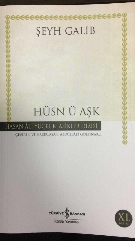 HÜSN Ü AŞK, ŞEYH GALİB tarafından kaleme alınmıştır. Kitap 2020 yılında TÜRKİYE İŞ BANKASI KÜLTÜR YAYINLARI tarafından [İSTANBUL] yayınlanmıştır. Bu baskının çevirisi ABDÜLBAKİ GÖLPINARLI tarafından yapılmıştır. 406 sayfadır. HÜSN Ü AŞK adlı eser Türkçe dilindedir.