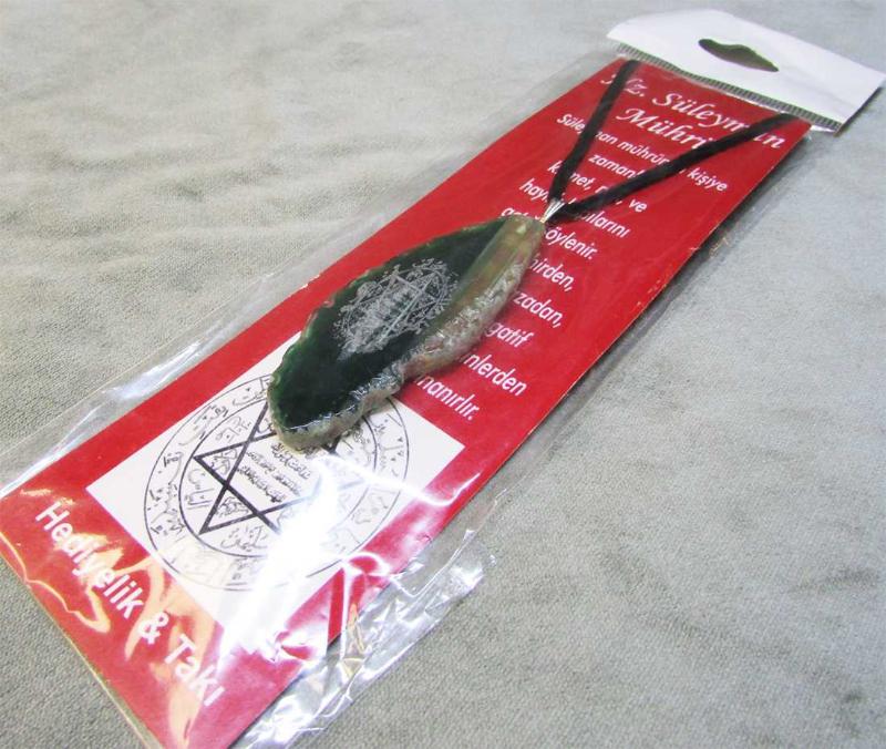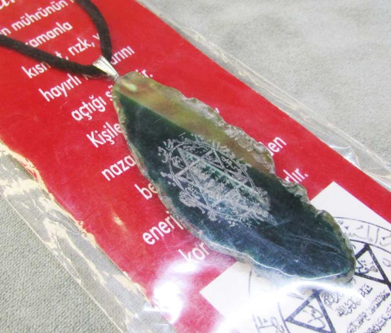 ÜZERİ ÇOK GÜZEL DİNİ "HZ.SÜLEYMAN MÜHRÜ" YAZILI BÜYÜK AKİK TAŞLI KOLYE, BİLGİ DETAYLARI ÜRÜN AMBALAJINDA YAZILIDIR, BOYUN BAĞI SUNİ DERİ YAPILIDIR, TERTEMİZ YENİ ÜRÜN, TAŞ KALINLIĞI 5mm, GENİŞLİĞİ 27mm,YÜKSEKLİĞİ 72mm KUSURSUZ ÜRÜNDÜR,AMBALAJI BOZMAYALIM DİYE AMBALAJINDA RESİMLEDİK,