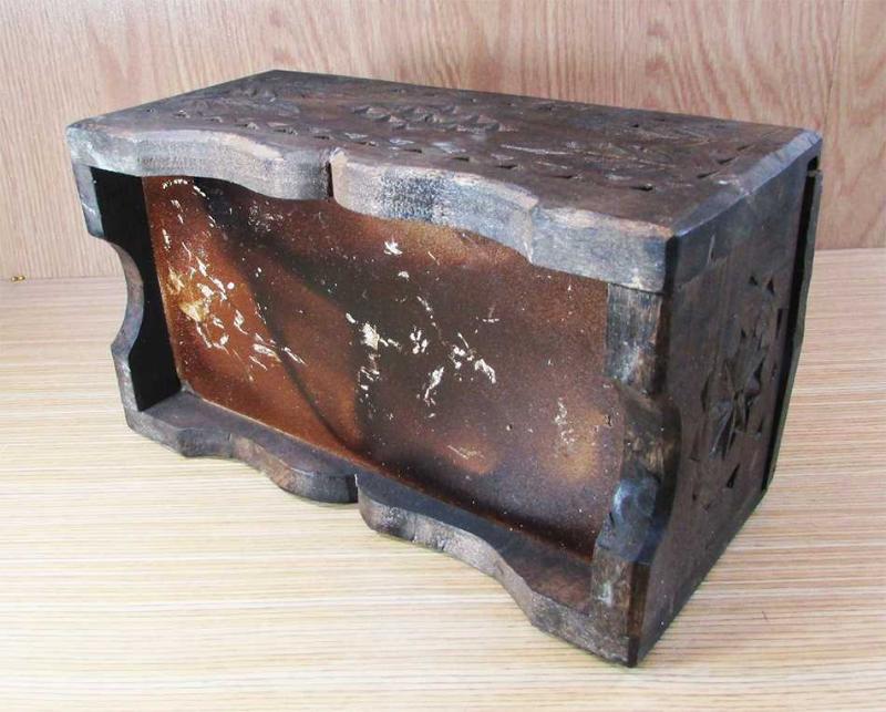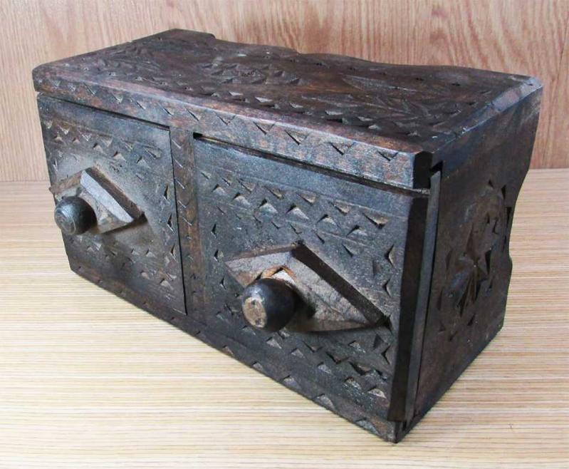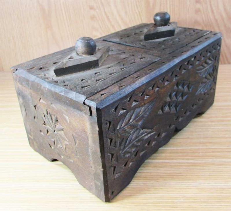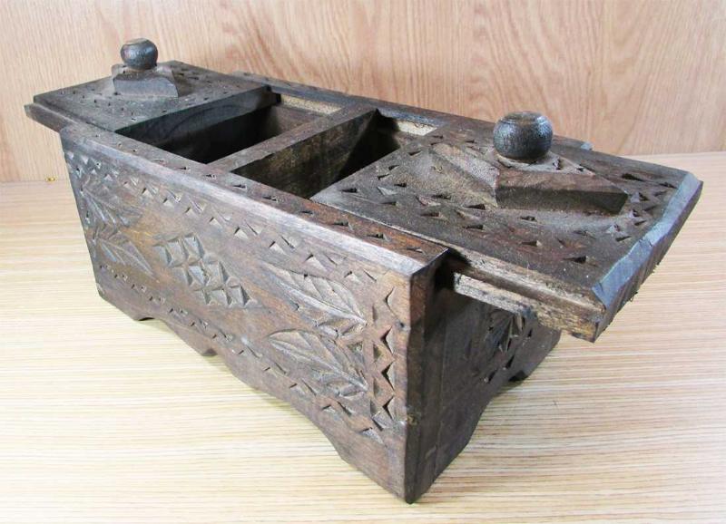 ESKİ DÖNEM EL İŞÇİLİĞİ İLE YAPILMIŞ ÇOK GÜZEL YAKIN DÖNEM AĞAÇ KAHVE-ŞEKER KUTUSU, ÇİFT SÜRME KAPAKLI, ÜZERİ VE YANLARI OYMA İŞÇİLİKLİ EL EMEĞİ GÖZ NURU MOTİFLİ SAĞLAM VE TERTEMİZ KENAR YÜKSEKLİĞİ 11,5cm GENİŞLİĞİ 13cm,UZUNLUĞU 23,5cm
