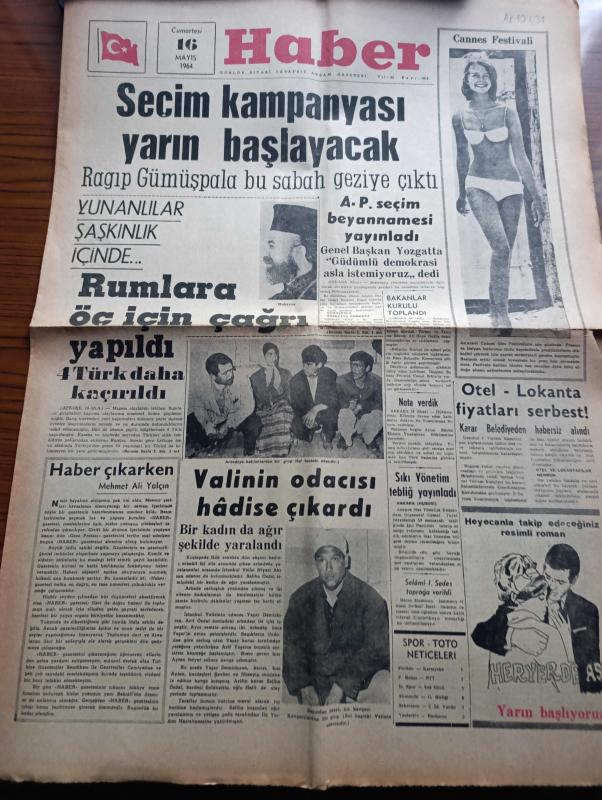 Haber Gazetesi - Turkish Newspaper - 16 Mayıs 1964 - haber çıkarken yazan Mehmet Ali Yalçın Başmakale - seçim kampanyası yarın başlayacak - Ragıp Gümüşpala bu sabah geziye çıktı - Adalet Partisi seçim beyannamesi yayınladı - 4 Türk daha kaçırıldı - Vali Niyazi Akı'nın odacısı Hadise çıkardı Fotoğrafı - otel lokanta fiyatları serbest - sıkıyönetim tebliğ yayınladı - Selami İzzet Sedes toprağa verildi - Tophane'de bir Hamlet yazan Bedrettin Nihat Yazı Dizisi - minibüse binenler azalıyor - Koçero yazan Nasri Oktay Yazı Dizisi - beyaz perdemizin enteresan kızı Pervin Par Fotoğrafı - Farah Diba'nın annesi sevinçli Fotoğrafı - Sultan Hamid'in büyük merakı yazan Cemal Yener Yazı Dizisi - Atatürk ve Kazım Karabekir Derleyen N. Deliorman Yazı Dizisi - Boyalı şapka yazan Agatha Christie Yazı Dizisi - küçük artist Ayşecik Zeynep Değirmencioğlu 50 bin lira ödeyecek - Fenerbahçe Onbiri Fotoğrafı - Beşiktaş 6 futbolcusu ile anlaştı - Hakkı Yeten - Beşiktaş ve Fenerbahçe Lefter Küçükandonyadis için adlı eser, Kitap > Süreli Yayınlar > Gazeteler > Türkiye > Genel > Günlük kategorisinde İkinci El olarak satıştadır.