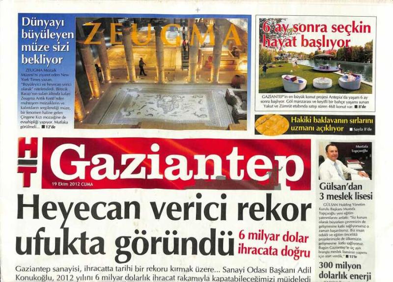 Haber Türk Gazetesi Gaziantep Eki 19 Ekim 2012 - Dünyayı Büyüleyen Müze Sizi Bekliyor * Zeugma - Angora Halı Hedef Büyüttü GZ124624, en son 19 gün önce güncellenmiştir.