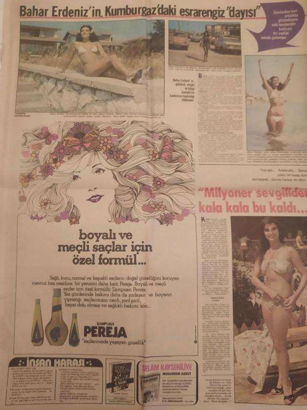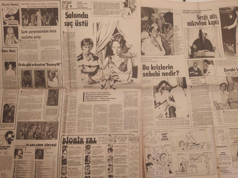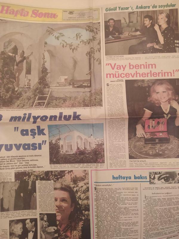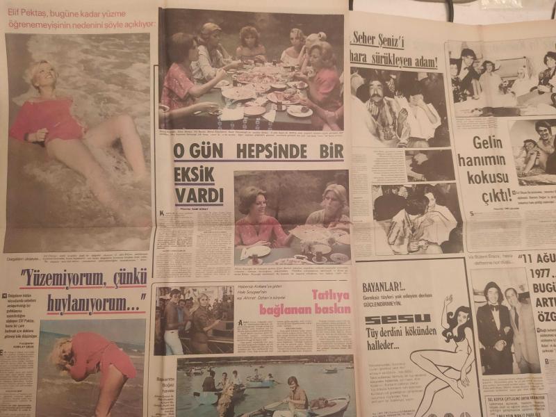 Hafta Sonu Haftalık Aktüalite Sinema Tiyatro Müzik ve Magazin Gazetesi - 12 Ağustos 1977 - Sayı:33 - Türkan Şoray kardeşi Nazan Şoray'ın yasak aşkına kesinlikle karşı çıktı - Rüçhan Adlı - Şevket Adlı - Erol Büyükburç - Prens Charles - Ajda Pekkan - Gönül Yazar'ı, Ankara'da soydular - Sarılığın yazı kışı yoktur - Taner Şener ''Felaket bana adım adım geldi'' - Brigitte Bardot - Annette Stoyberg - Catherine Deneuve - Catherine Schneider - Asu Maralman kalafattan geçti - Güzele ne yaraşmaz - Gülsen Erad - Güler Yiğit - Selma Kip - Salonda Suç Üstü - Erol Evgin - Ayla Algan - Turan Güneş - Naim Akan - Sarığı attı, mikrofonu kaptı - Seyyal Taner bu krizlerin sebebi nedir? - Naim Akan - Garip Ama Gerçek çizgi romanı - Elif Pektaş ''Yüzemiyorum, çünkü huylanıyorum'' - Hale Soygazi'nin eşi Ahmet Özhan'a sürprizi - İşte, Seher Şeniz'i intihara sürükleyen adam! - İskender Doğan'ın ailesi ateş püskürüyor - Okşan Ay - Bülent Ersoy, hatıra defterine not düştü - Sevda Karaca - Tam Takım Gazete Yıpranma, sararmalar, kupon kesiği ve yırtılmalar zamana bağlı olarak görülebilir