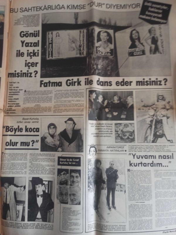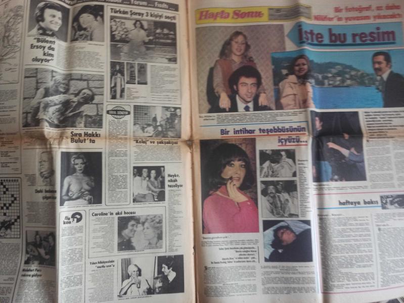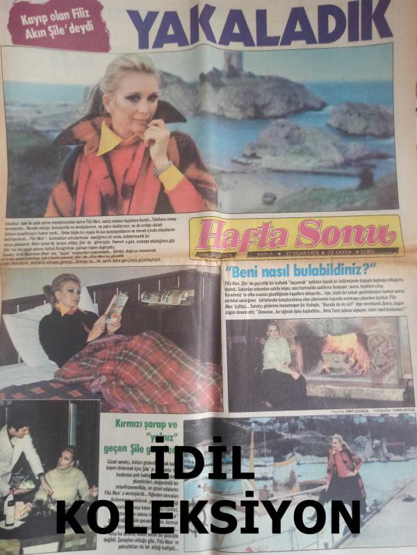Hafta Sonu Haftalık Aktüalite Sinema Tiyatro Müzik ve Magazin Gazetesi - 27 Ocak 1978 - Sayı:5 - Kayıp olan Filiz Akın Şile'deydi - Kırmızı şarap ve ''yalnız'' geçen Şile geceleri - Mine Mutlu - Ünal Çulha - Michael Landon - Melahat Pars - Alpay ve Karabay - Öztürk Serengil - Bülent Ersoy - Türkan Şoray - Nilüfer - Seher Şeniz - Sevda Ferdağ - Haftaya bakış - İştahsızlık da bir hastalıktır - Ajda Pekkan - Belgin Doruk - Belkıs Balkaş - Neydi Neydi Ne? - Ela Koşay - Filiz Kayalı - Berrak Aktar - Güzele Ne Yaraşmaz - Ölüler Kumar Oynamaz Hikayesi - Timur Selçuk - Cüneyt Gökçer - Gönül Tansel - Garip Ama Gerçek - Emel Sayın - İsmet Kasapoğul - Gönül Yazar ile içki içer misiniz? - Farah Pehlevi - Cevat Kurtuluş - Fatma Girik ile dans eder misiniz? - Cüneyt Arkın ile Tarık Akan Ölümü Göze Aldılar fotoğraf ve haberi - Tam Takım Gazete Yıpranma, sararmalar, kupon kesiği ve yırtılmalar zamana bağlı olarak görülebilir