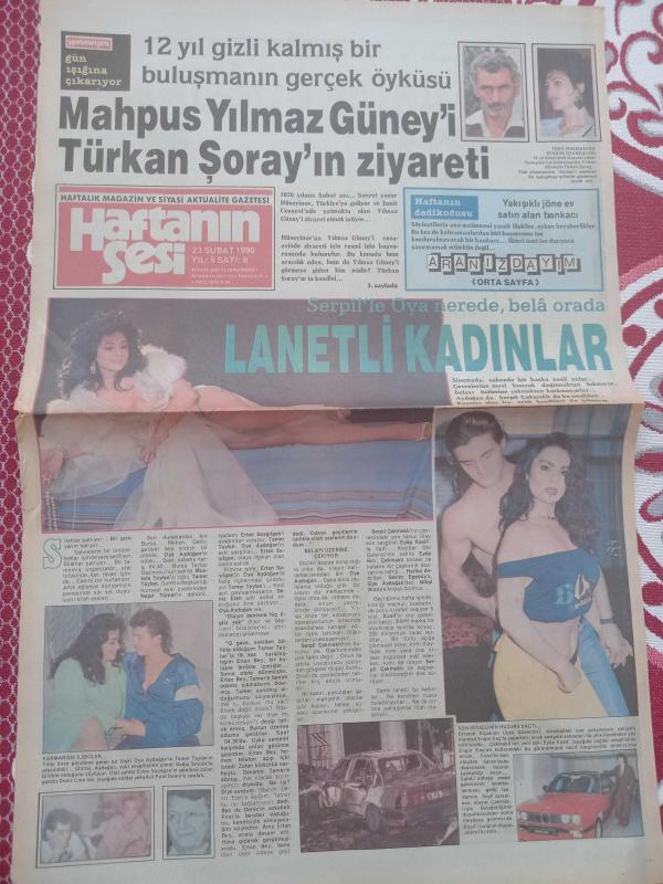 Haftanın Sesi Haftalık Magazin ve Siyasi Aktüalite Gazetesi önlü arkalı 2 sayfa 23Şubat 1990 Yılmaz Güney-Türkan Şoray-Oya Aydoğan-Serpil Çakmaklı-Eyüp Kosif-Engin Çağlar-Yasemin Evcim-Sertip Gücün-Rıdvan Dilmen-Naim Süleymanoğlu-Moda Yüzleri reklamı 36*56cm adlı eser Türkçe dilindedir.