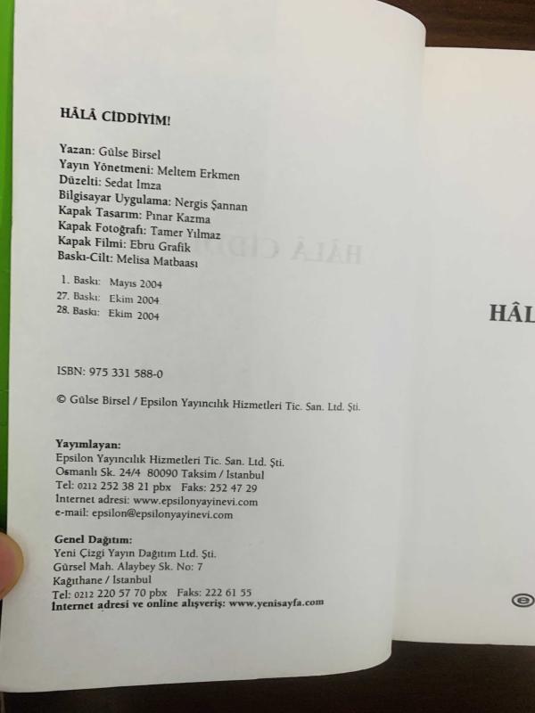 Hala Ciddiyim, Gülse Birsel tarafından kaleme alınmıştır. Kitap 2004 yılında Epsilon tarafından yayınlanmıştır. 224 sayfadır. Hala Ciddiyim adlı eser Türkçe dilindedir.